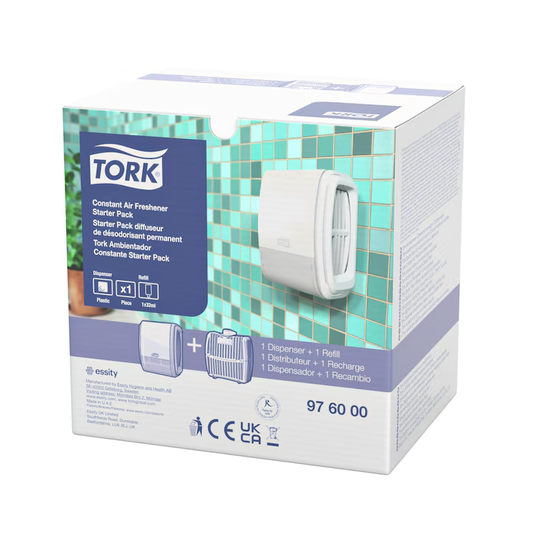Kontrollera dålig lukt effektivt i toalettutrymmet med Tork Airfreshener Konstant Starter Pack. Innehåller en dispenser och en Bris-refiller. Tork Airfreshener Konstant Dispenser med Elevation-design använder en unik, högteknologisk distributionsteknik som jämnt och oavbrutet sprider doften i utrymmet. ”Easy to use”-certifierad för enkel påfyllning.