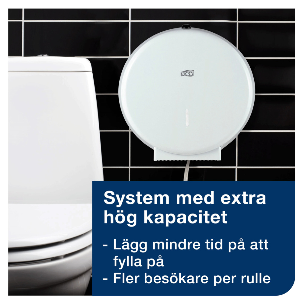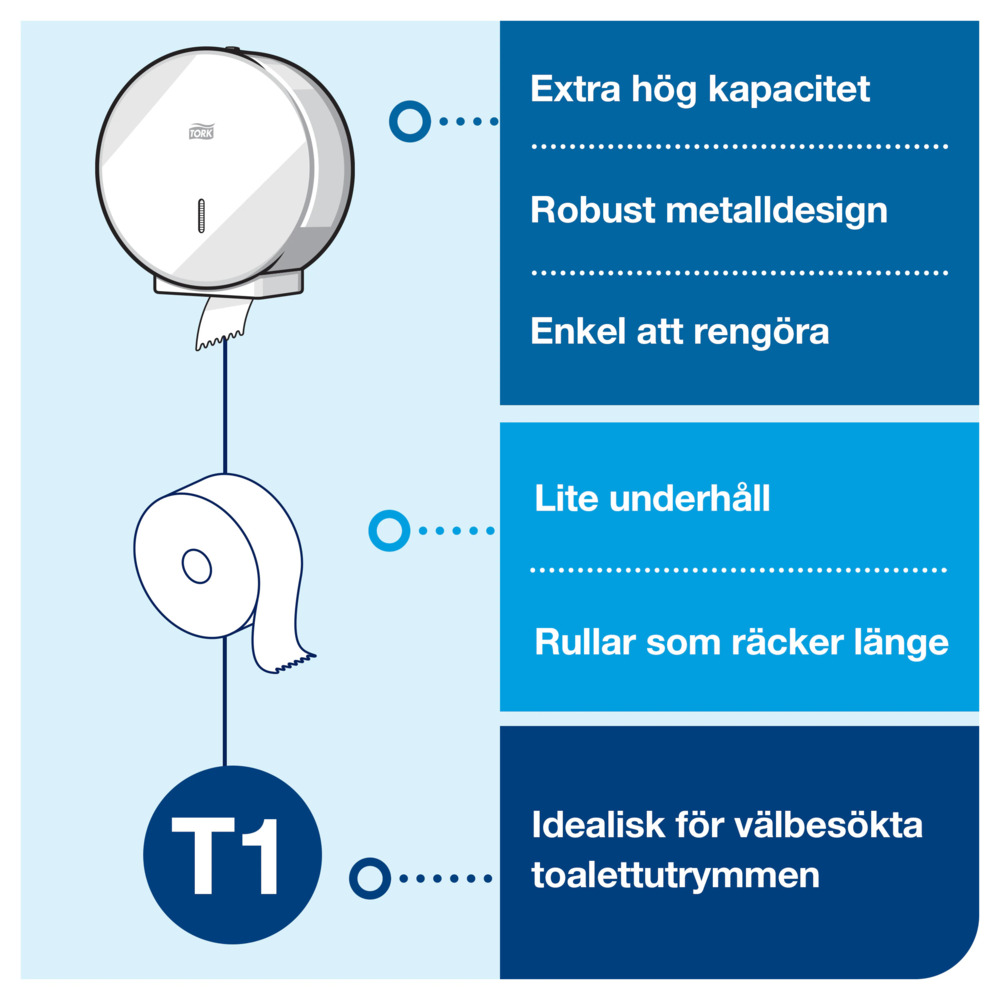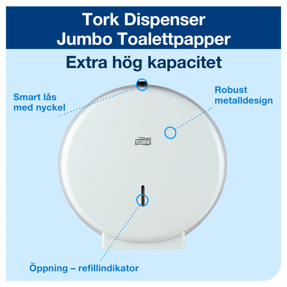 Tork Dispenser Jumbo Toalettpapper är särskilt lämplig för utrymmen med hög besöksfrekvens. Den extra höga kapaciteten minskar underhållstiden och säkerställer att det alltid finns papper tillgängligt. Dispensern har en robust metalldesign med låsbar funktion, vilket skyddar toalettrullarna i medel- till högtrafikerade toalettutrymmen. Kompatibel med Tork T1 refiller.