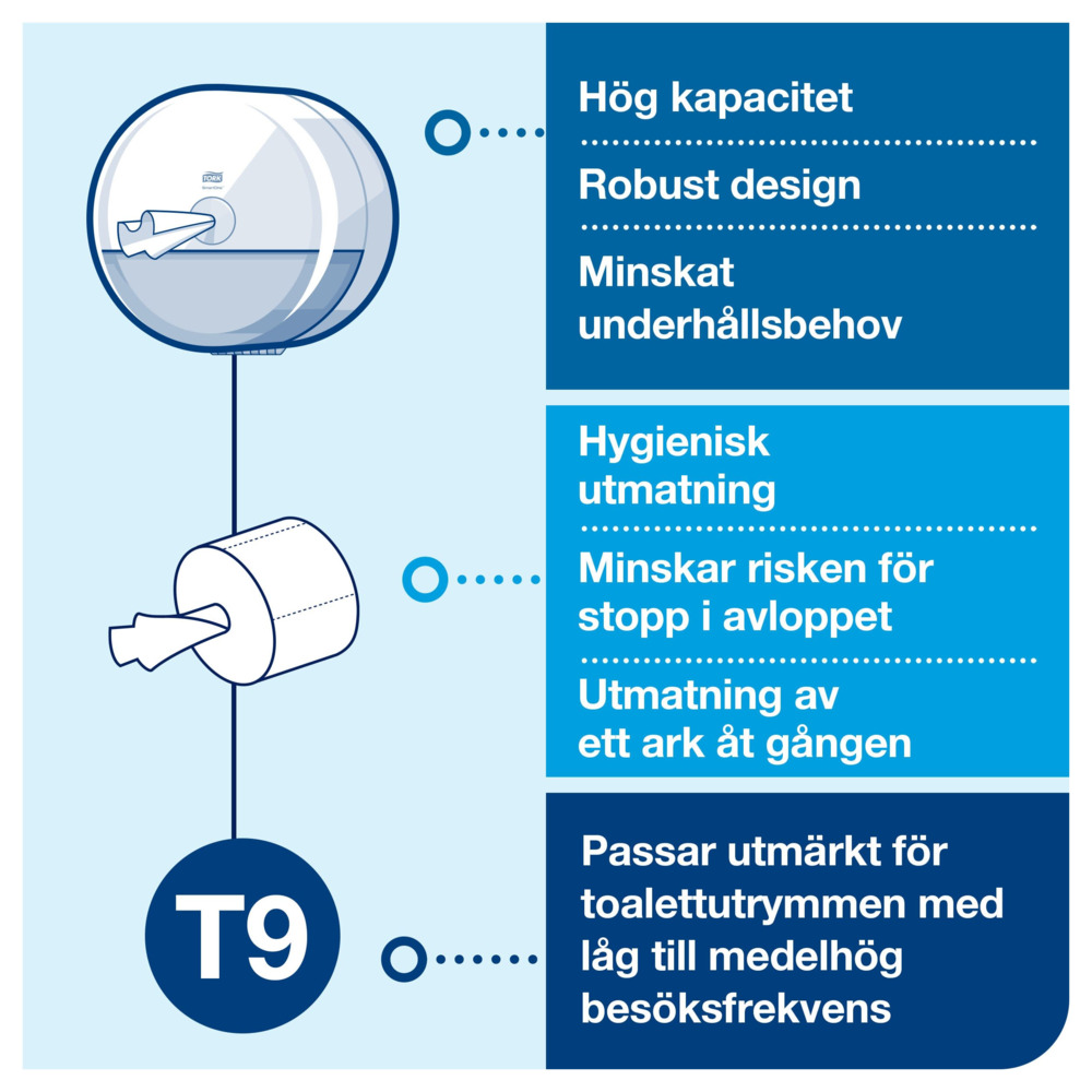● Bidra till bättre hygien och lägre kostnader – Tork SmartOne® Mini Dispenser är utformad för toalettutrymmen med låg eller medel besöksfrekvens.