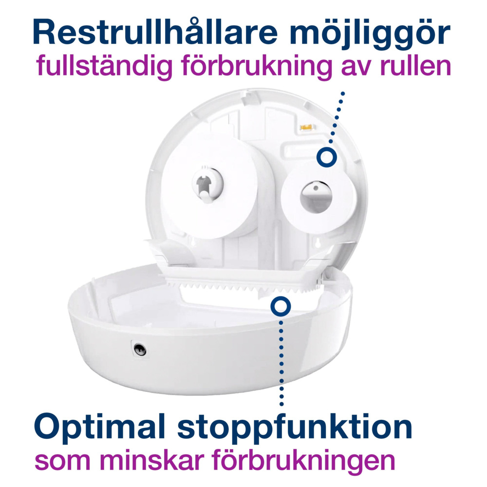 Välbesökta toalettutrymmen kräver dispensrar för toalettpapper som är hygieniska och enkla att sköta – vår slutna dispenser skyddar rullarna från smuts och stänk, och den höga kapaciteten gör att toalettpapper alltid finns tillgängligt samt minskar behovet för påfyllning. Minska avfallet med den optimala rullbromsen och smarta rullhållaren för restpapper, som hindrar rullen från att rotera fritt och gör att allt papper utnyttjas. Dispenserns moderna design är en smidig lösning för varje toalettutrymme.