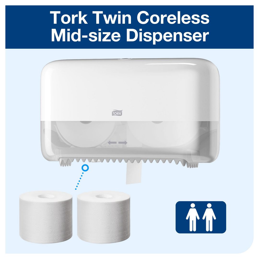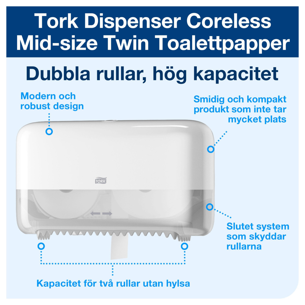 ● Dispenser med hög kapacitet som har plats för två mellanstora rullar, vilket ger ett minskat påfyllningsbehov.