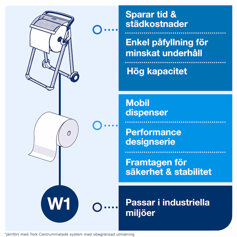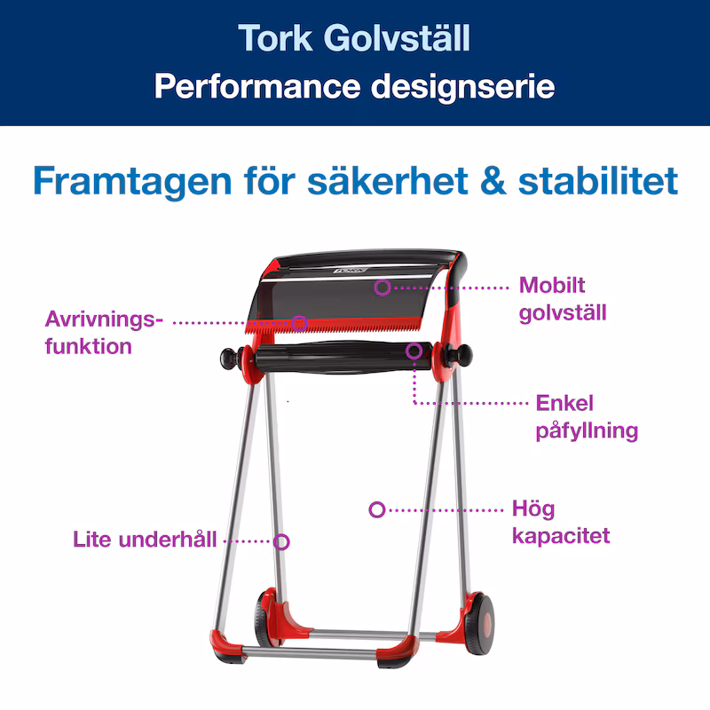 Tork Golvställ i Performance-design har utvecklats för säkerhet och stabilitet med funktioner för tillförlitlig avrivning och enkel påfyllning. Tork Performance är nästa generation av dispensrar för avtorkning i arbetsmiljöer. Rätt kombination av dispensrar och avtorkningspapper kommer att öka produktiviteten och samtidigt minska dina totala förbrukningskostnader.