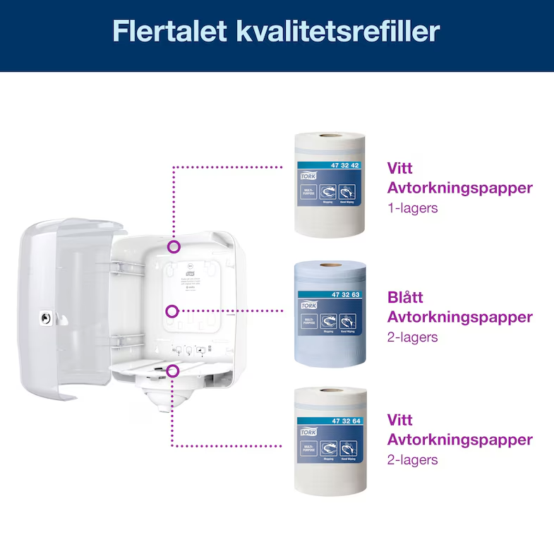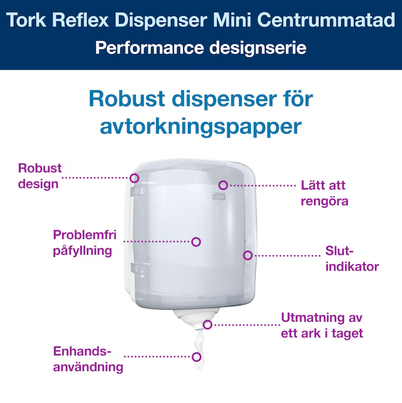 Tork® Reflex® Dispenser Centrummatad är den perfekta lösningen för hand- och ytavtorkning i professionella miljöer och har utformats för att passa din miljös arbetsflöde. Vidrör endast det du använder med utmatning av ett ark i taget och nå pappret från vilken vinkel som helst med den roterande munstycksfunktionen. Detta lättanvända, hygieniska och slitstarka system minskar förbrukningen med upp till 37 % jämfört med andra centrummatade dispensrar från Tork®.