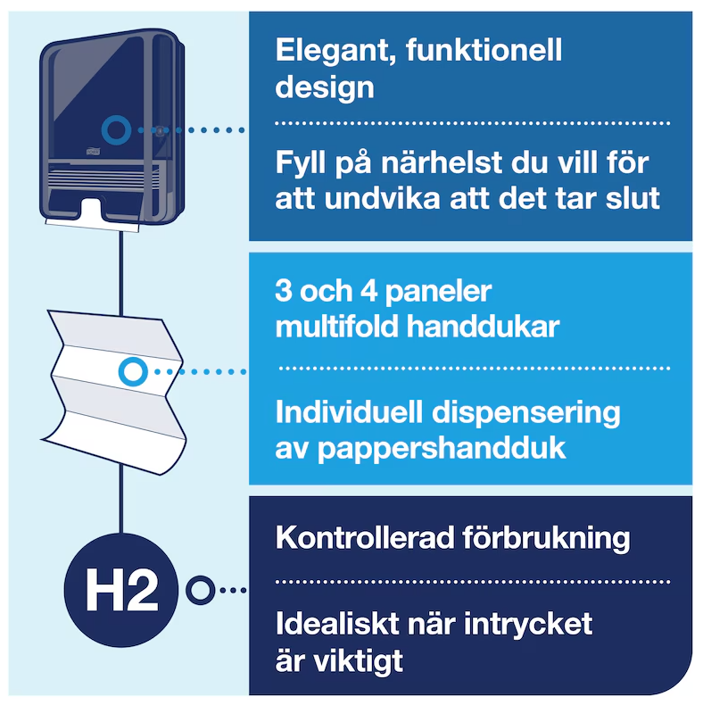 Tork Xpress® Dispenser Multifold Handduk H2 Svart i Elevation-design är en kompakt och attraktiv dispenser som passar perfekt för miljöer med höga krav på komfort och hygien. Den moderna designen minskar förbrukning och avfall tack vare utmatning av ett ark i taget, samtidigt som den skapar ett långvarigt intryck hos besökarna.