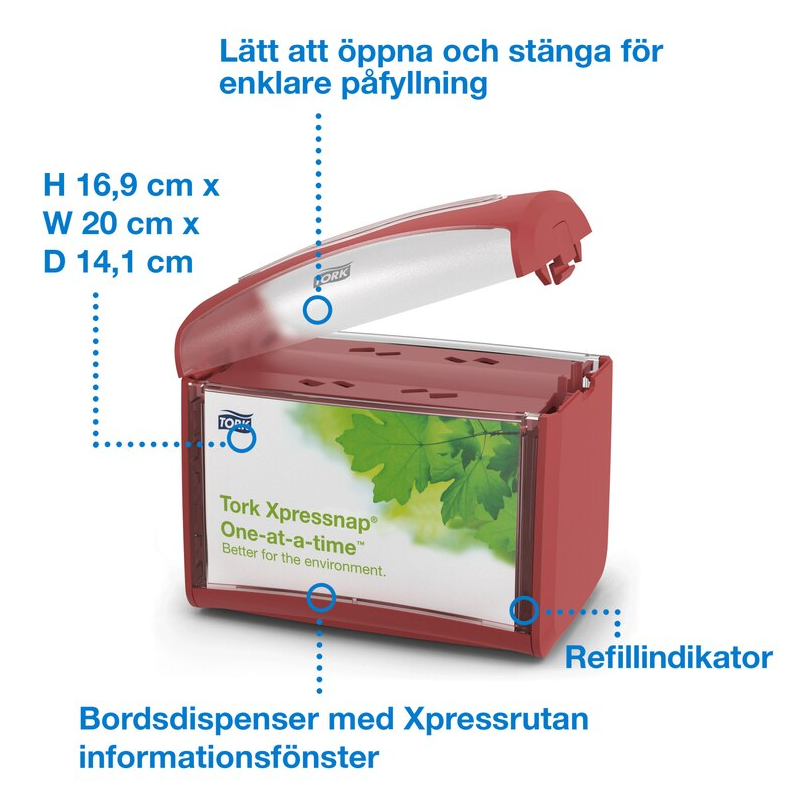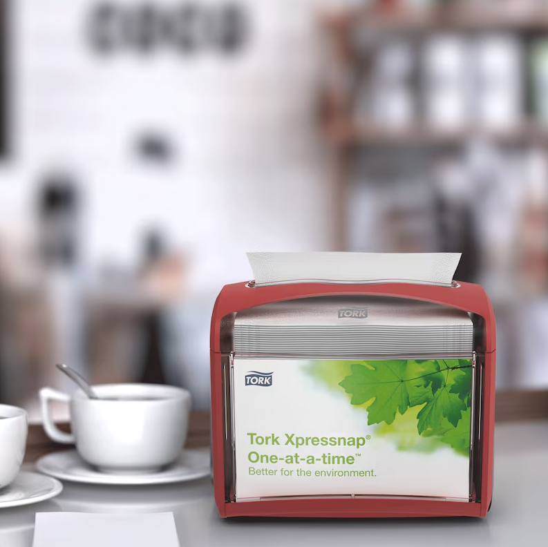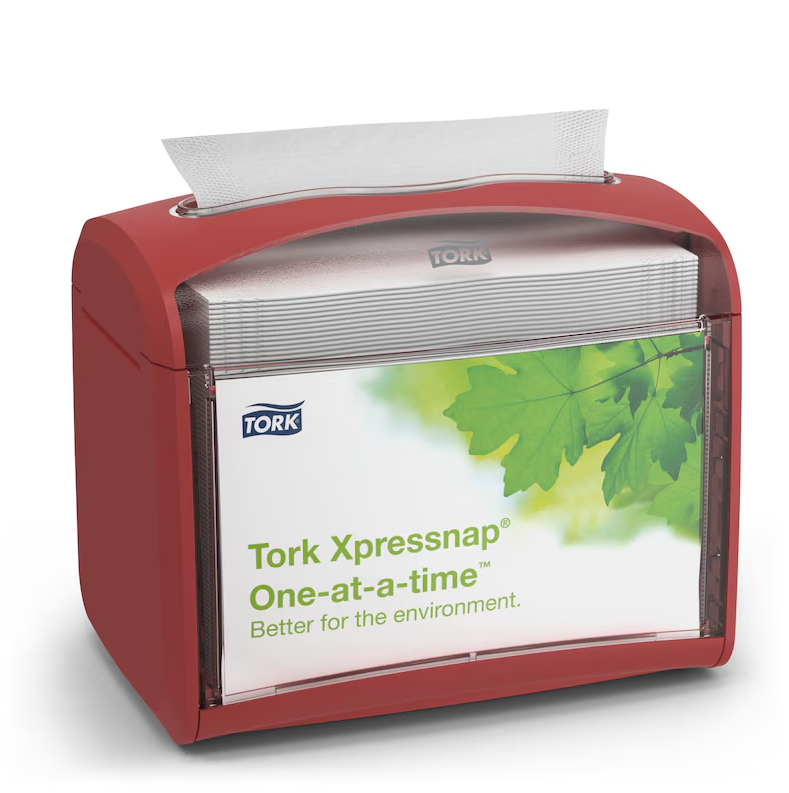 Tork Xpressnap® Stående Dispenser passar perfekt för restauranger med begränsad service där man erbjuder servetter vid bordet. Den här kompakta och moderna dispensern matar ut en servett i taget. Resultatet blir förbättrad hygien och minskad förbrukning med minst 25% jämfört med traditionella servettdispensersystem. Tillgänglig i ett stort urval av moderna färger som är lätta att matcha med din inredning.