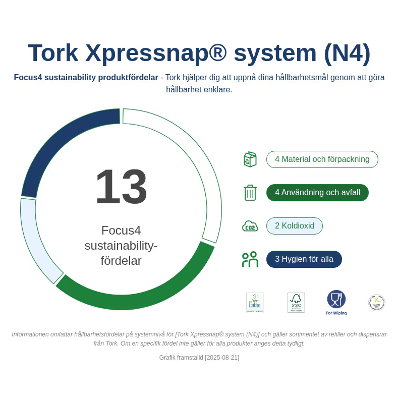 Tork Xpressnap® har under sin totala livscykel (cradle-to-grave) ett genomsnittligt koldioxidavtryck på 3,5 g CO2-ekv. per användning, där de tre första stegen i livscykeln (cradle-to-gate) står för 2,2 g CO2-ekv. per användning. (Gäller endast för EU)*