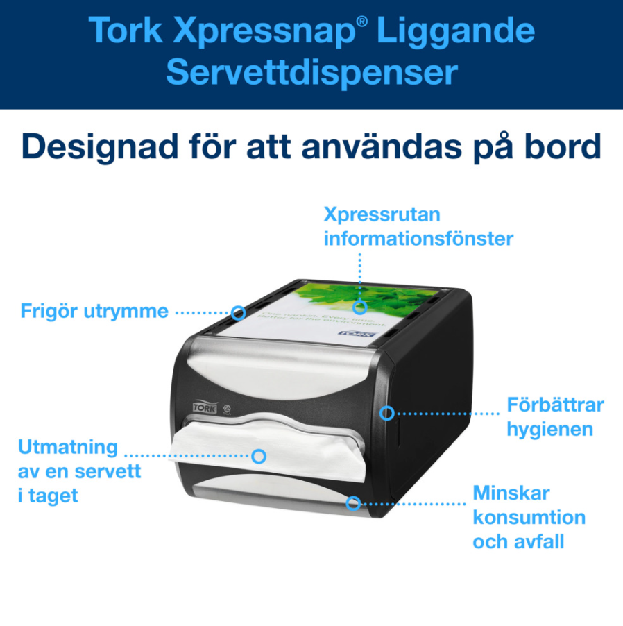 Tork Xpressnap® Liggande Dispenser passar perfekt för restauranger med begränsad service där man erbjuder servetter på en central plats. Den moderna dispensern matar ut en servett i taget. Resultatet blir förbättrad hygien och minskad förbrukning med upp till 43 % jämfört med traditionella servettdispensersystem.