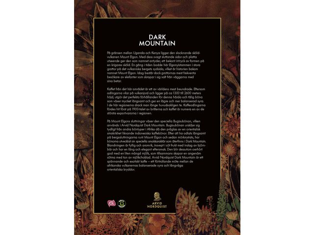 Arvid Nordquist Dark Mountain Mörk är ett mörkrostat kaffe med intensiv smak och rik arom. Det består av 100% handplockade Arabicabönor från Brasilien och Centralamerika. Den mörka rostningen framhäver fylliga inslag av karamell, björnbär, cederkrydda och valnöt, vilket ger en balanserad och lång eftersmak med elegant syrlighet och mild bitterhet. En nybryggd kopp erbjuder en kraftfull, bärig och välbalanserad smakupplevelse.