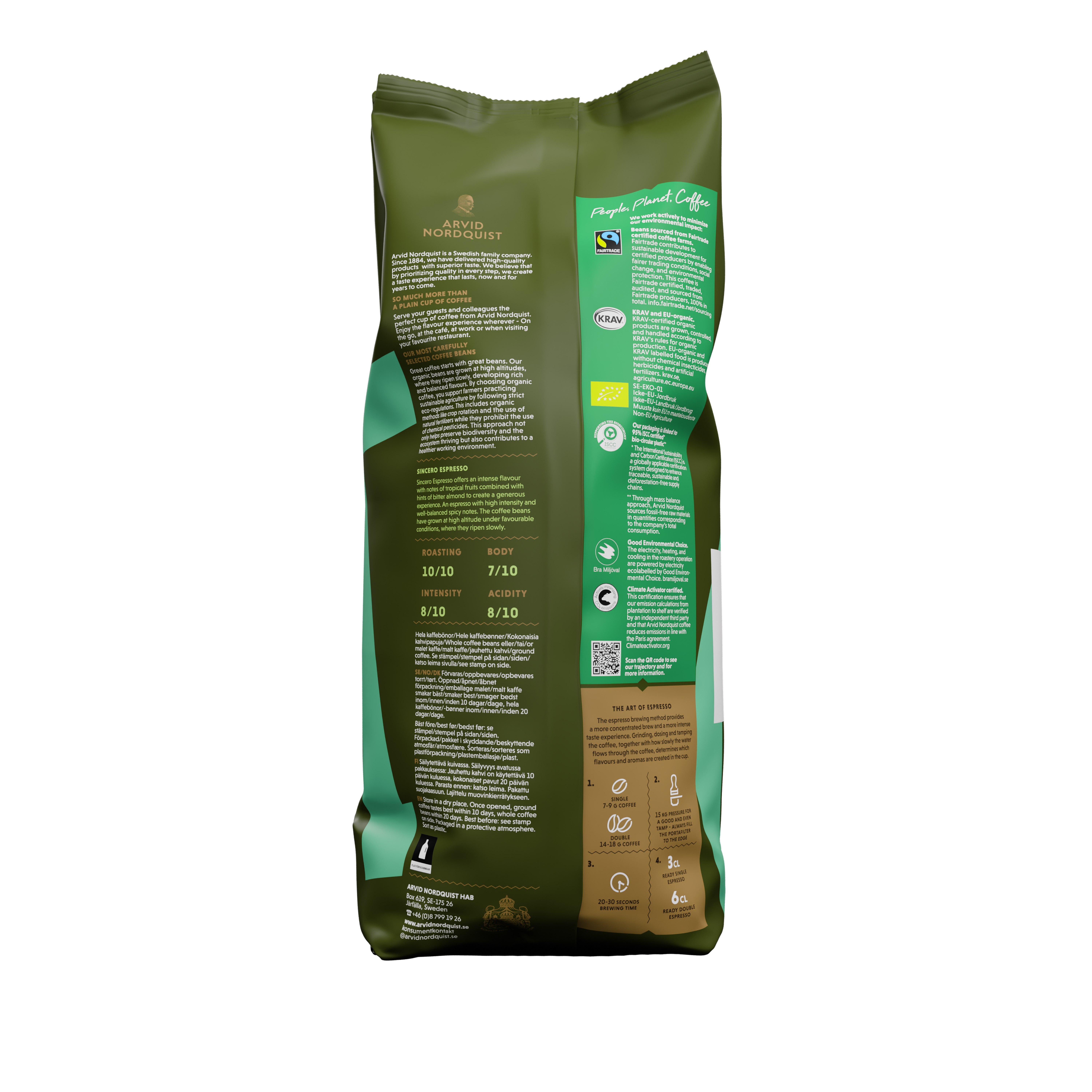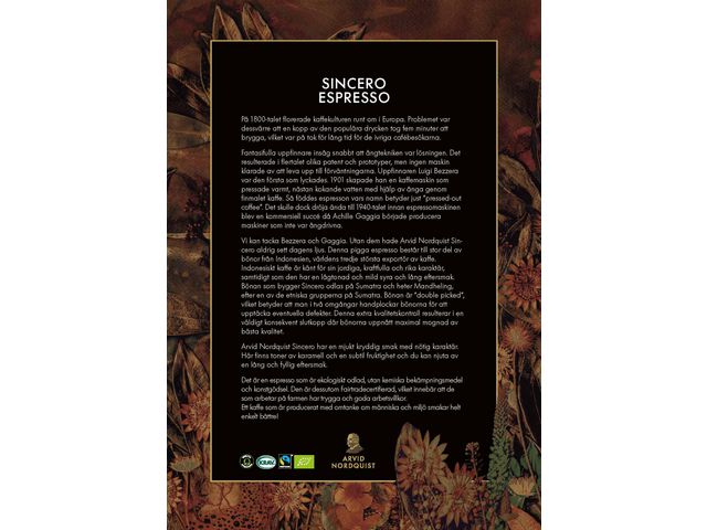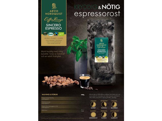 Arvid Nordquist Espresso Sincero är ett elegant och smakrikt kaffe med en härligt frisk ton. Kaffet är gjort på 100% Arabicabönor från Centralamerika, Östafrika och Indonesien och har en mjukt kryddig karaktär med inslag av karamell, kanderat socker och subtil fruktighet. Sincero är en ekologisk espresso – en ovanlig men uppskattad kombination som ger en rik och balanserad smakupplevelse. Den långsamma rostningen på italienskt manér framhäver bönornas naturliga sötma och ger en rund och behaglig eftersmak. Precis som allt kaffe från Arvid Nordquist är Sincero 100% klimatkompenserat, Fairtrade-certifierat och KRAV-märkt.