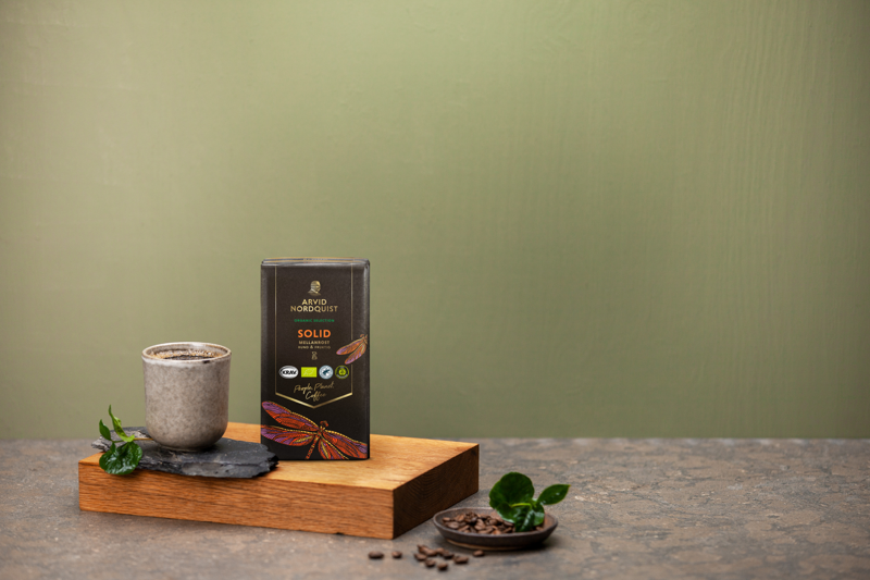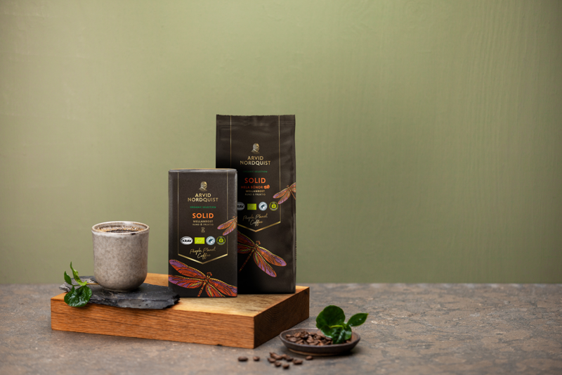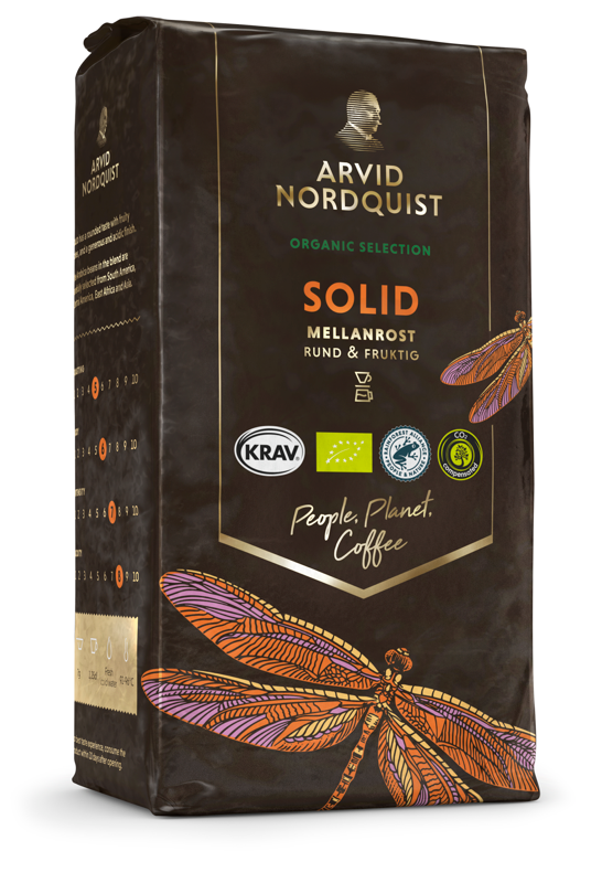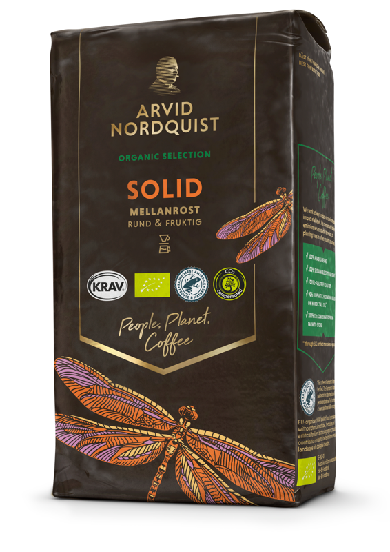 Solid är ett mellanrostat kaffe med rund och balanserad smak. Doften bjuder på karamell och mandel medan smaken har inslag av fikon och en fruktigt syrlig eftersmak. Solid är gjort på 100% ekologiska Arabicabönor av högsta kvalitet och är 100% hållbart certifierat samt helt klimatkompenserat. Ett kaffe som uppskattas av de flesta och smakar lika gott svart som med en skvätt mjölk eller grädde.
