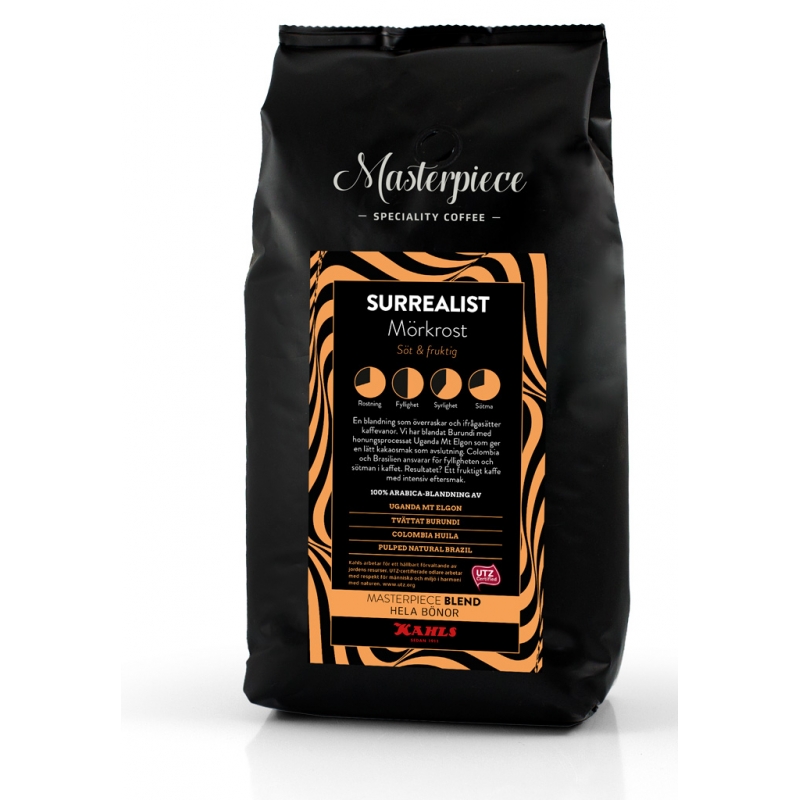 Kahls Hela Bönor Masterpiece Surrealist är en blandning som överraskar och ifrågasätter kaffevanor. Bönorna från Burundi är en del av vårt arbete med ursprung, där vi arbetar för ökad inkomst och levnadsstandard för kaffeodlaren. Dessa har vi blandat med honungsprocessat Uganda Mt Elgon som ger en lätt kakaosmak. Colombia och Brasilien bidrar med fyllighet och sötma i kaffet. Resultatet är ett fruktigt kaffe med intensiv eftersmak.