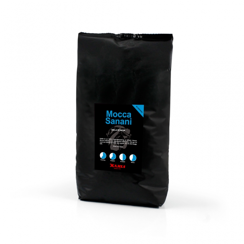 Kahls Hela Bönor Mocca Sanani RFA SG är ett mörkrostat kaffe gjort på 100% Arabica-bönor från Latinamerika. Bönorna är odlade enligt reglerna för ekologisk produktion. Smaken är mellanfyllig med god syrlighet och mild eftersmak. I doften hittar man inslag av kola och röda bär.