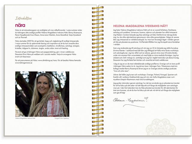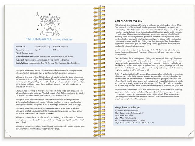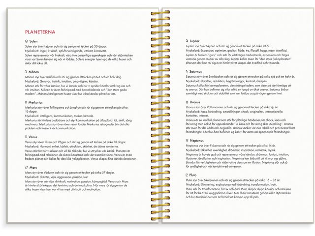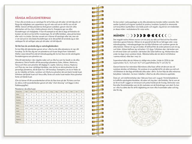 Bjud in astrologin i ditt liv! Ett nytt år står för dörren. Är du redo att börja följa ditt astrologiska flöde? Låt 2026 bli det år då du använder astrologin för att ta vara på dina möjligheter! Du får råd om när du ska öka tempot och när du behöver ta det lugnt. Astrologi kan tillämpas på olika områden, både på det stora i livet och på aspekter som kärlek, hälsa, ekonomi, karriär och din personliga utveckling. I den här A5 veckokalendern kommer du att lära dig hur du kan följa ditt eget stjärnteckens inflytande varje vecka och månad under året. I kalendern kommer du att lära dig om astrologi och om dig själv! Den är utformad för att du ska kunna använda den för att skapa det bästa möjliga 2026! Så att du kan göra rätt saker vid rätt tidpunkt och förstå det energiflöde som omger dig. Varje månad kommer du att kunna läsa om hur nymånens och fullmånens påverkan kan påverka dig. Det kommer att hjälpa dig att ta nya steg vid nymånen och avsluta projekt vid fullmånen.