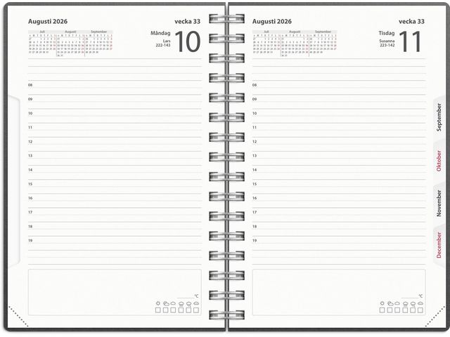 ● Layout: Dag/sida. Timindelning 8-19