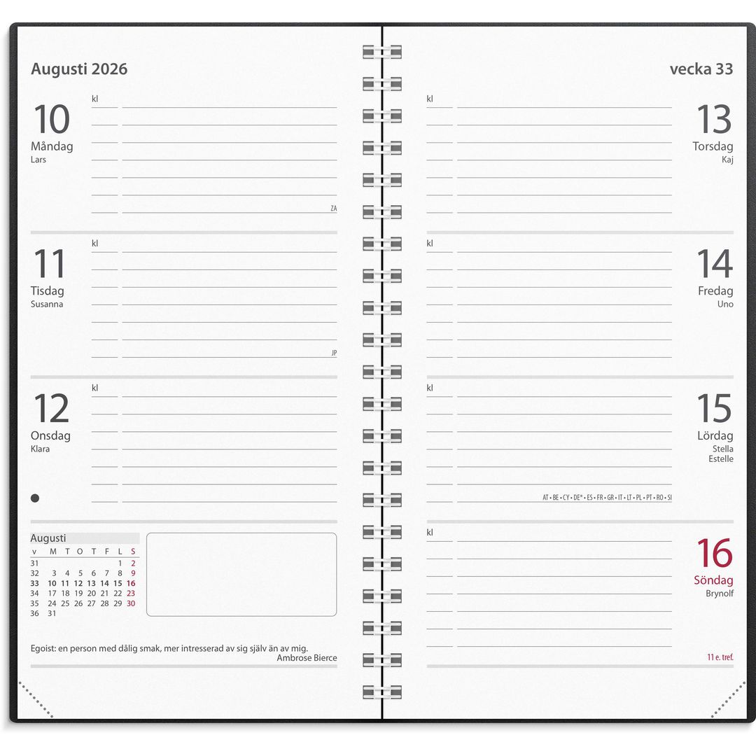 En vecka per uppslag, datum för religiösa högtider för islam och judendom. Årsplaner för innevarande och följande år. Anteckningshäfte.