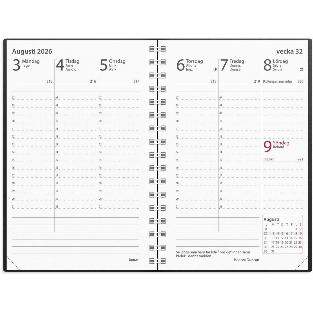 ● Layout: Stående. Vecka/uppslag. Timindelning 7-21