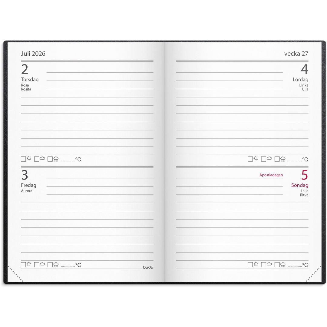 ● Omslag: Konstläder. Inbunden. Innehåll: Kyrkliga helgdagar, Flaggdagar, Helgdagar/aftnar, Månfaser, Namnsdagar, Anteckningssidor, Internationella helgdagar översikt, Temadagar/händelser, Årsöversikt/årsöversikter, Årsplan/årsplaner