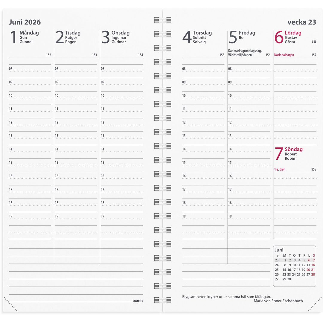 ● Layout: Stående. Vecka/uppslag. Timindelning 8-19