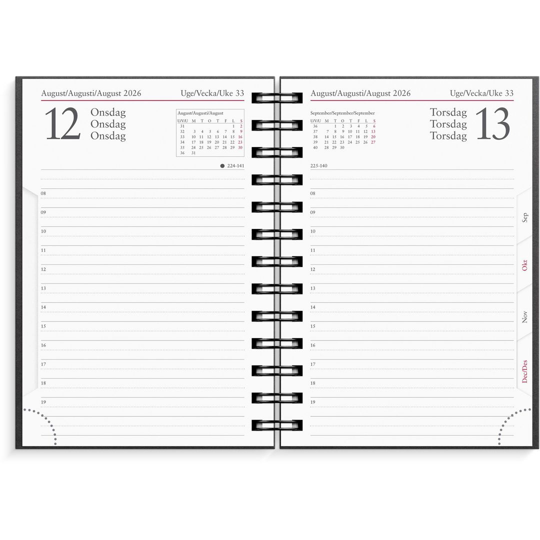 3-språkig kalender med svart kartongomslag. Årsplaner för Norge, Danmark och Sverige för innevarande och kommande år. Nationella helgdagar i världen. Telefonregister och prefix till utlandet. Avståndstabell i Europa. Linjerade anteckningssidor.