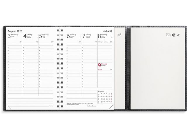 ● Innehåll: Atlas, Kyrkliga helgdagar, Flaggdagar, Helgdagar/aftnar, Månfaser, Namnsdagar, Anteckningshäfte, Internationella helgdagar översikt, Telefonregister, Temadagar/händelser, Årsöversikt/årsöversikter, Årsplan/årsplaner