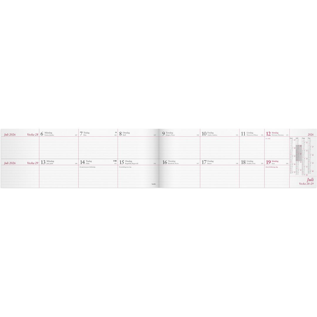 Häftad. Två veckor per uppslag. Format: 510x95 mm (uppslagen).