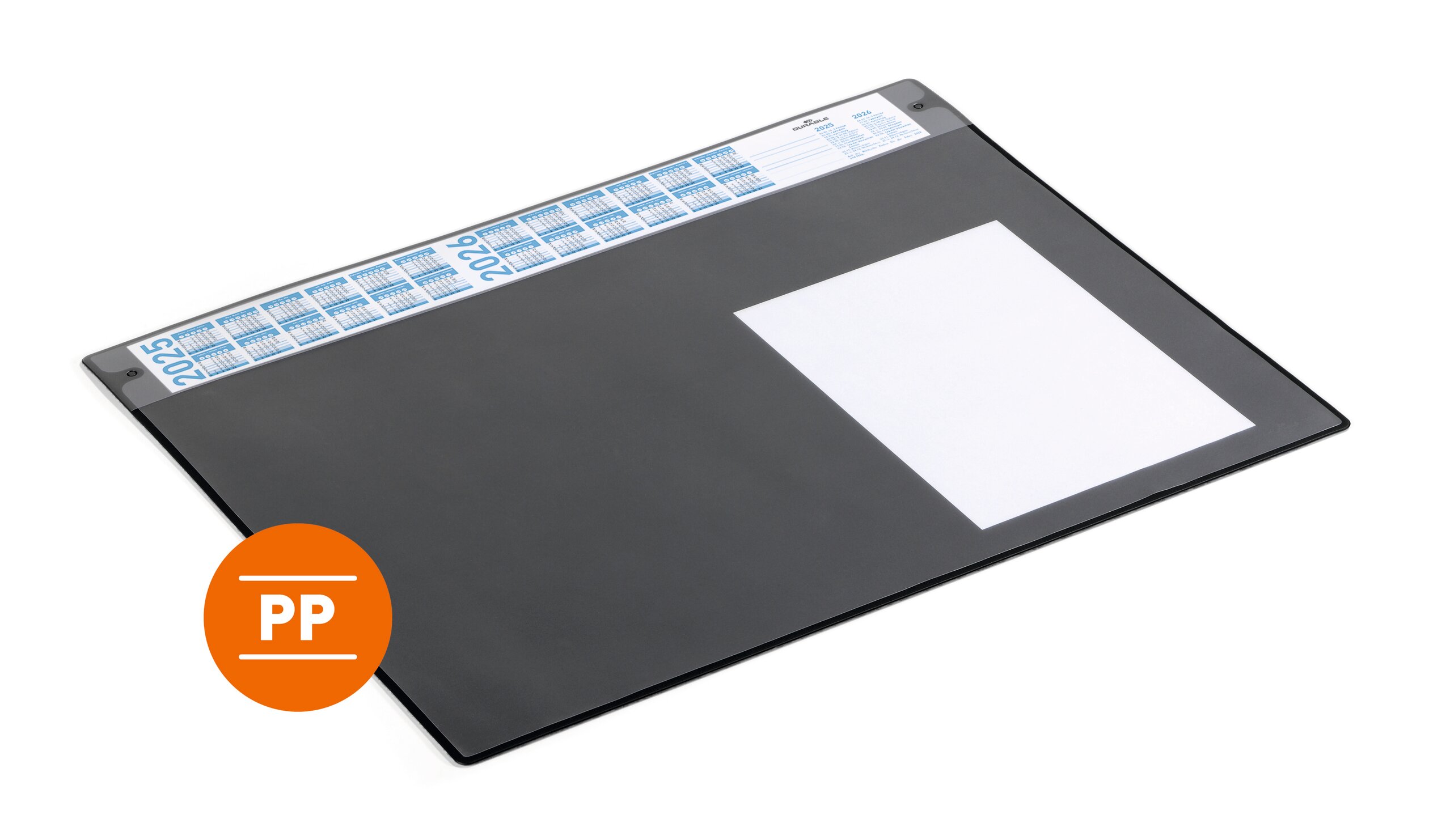 Använd skrivbordsunderlägg för att skydda bordet mot slitage. Detta underlägg har transparent, reflexfri och borttagbar klaff som det går att förvara noteringar, anteckningar och lappar under. Dessutom en smal översiktskalender för 4 år. Tack vare en tillverkningsmetod som gör att undersidans yta får bra grepp, ligger underlägget stadigt på bordet utan att glida. Kan torkas av med en fuktig trasa på båda sidorna. Tillverkad av polyproylen och 100% återvinningsbar.
