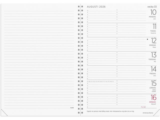 Kalender med löst omslag med slejf, fyra kreditkortsfickor, en större ficka och pennhållare. En klassisk kalender med en vecka per uppslag, där vänstersidan har linjerade sidor för anteckningar och högersidan timindelning 08-17. I slutet hittar du extra sidor för anteckningar och en lättöverskådlig årsplanering. Enkelt och tydligt med fokus på det viktigaste!