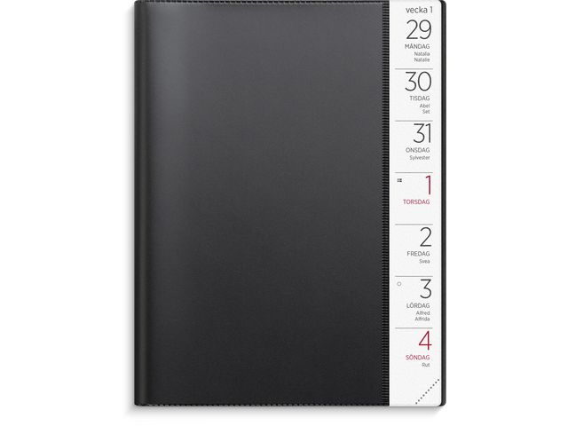 Kalender med en vecka per uppslag. Hela vänster sida på alla uppslag är linjerade. Timindelad 8-17. Markeringar för internationella helgdagar. Årsplaner för innevarande och följande år samt löst telefonblad.