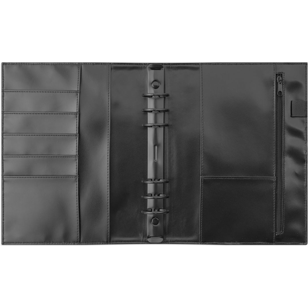 Systemkalender med grundsats. Grundsatsen innehåller hålad kalenderdel (4801) och blankettdel. Pärmen har ringmekanism (Ø 30 mm), fem kreditkortsfickor, stort myntfack med dragkedja, fack för kvitton o dyl och pennhållare.