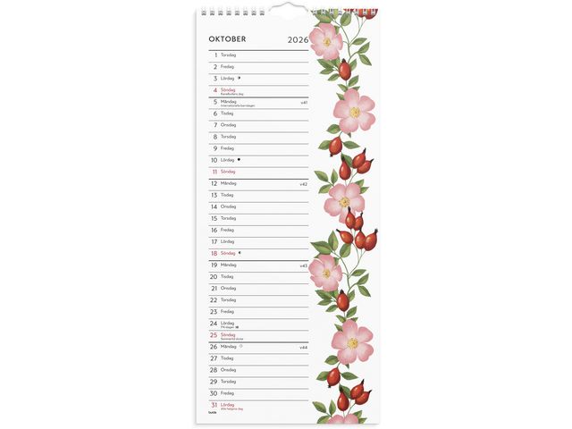 Väggkalender för hemmet men blomillustrationer. En månad per uppslag och en rad för varje dag/månad som gör att du snabbt och lätt kan överskåda dina övergripande planer för månaden.