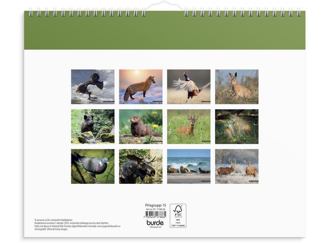 Väggkalender med information om när jaktperioder inträffar för olika djur i Sverige via en QR-kod. Soltider för tre horisonter. Vackra bilder på svenska vilda djur.