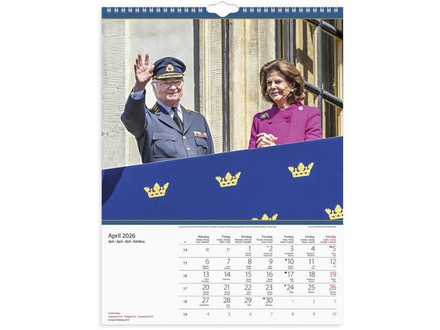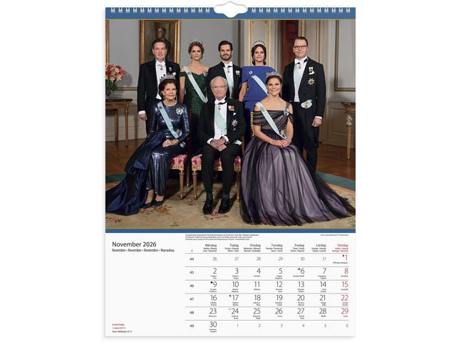 Bilder på svenska kungafamiljen, den är femspråkig (svenska, engelska, tyska, spanska och finska) och har svenska namnsdagar.