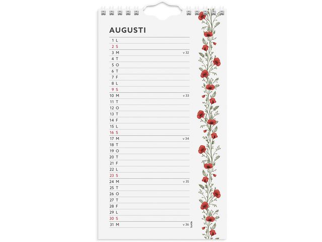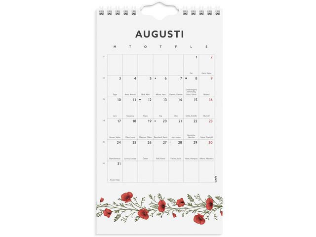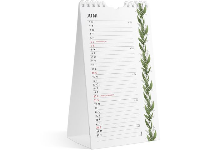 Liten, lättplacerad väggkalender och bordskalender i ett! Häng den på väggen eller veckla ut kartongbakstycket och ställ den på skrivbordet. Kalendern har söta blomstermotiv. Två olika layouter syns samtidigt varje månad när den står på bordet, varav den ena layouten har mer anteckningsyta. Välj vilken layout du vill ha när du hänger den på väggen.
