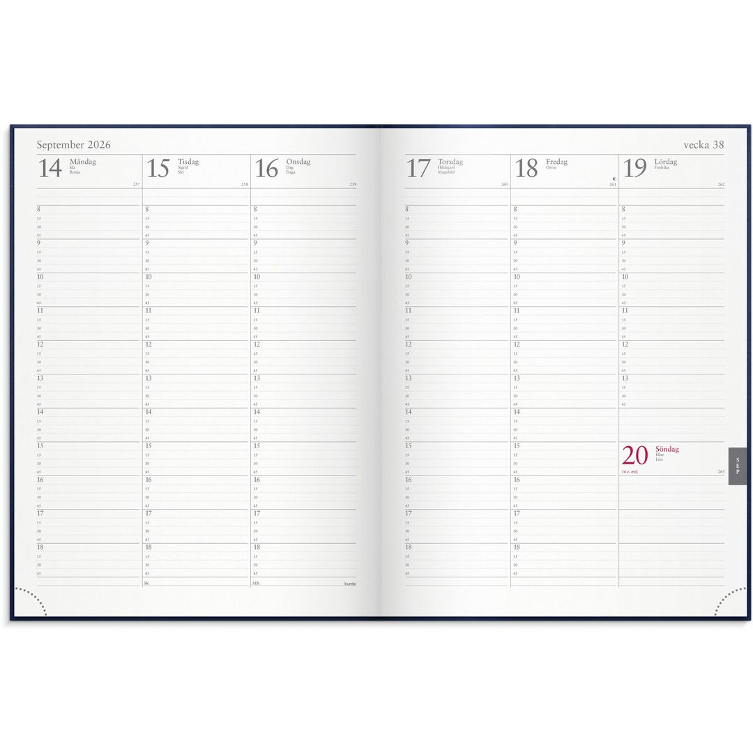 Kalender med utrymme för veckans alla bokningar. En vecka per uppslag med kvartsindelning 8-19. Kalendariet innehåller markeringar för internationella helgdagar. Årsplaner för innevarande och följande år.