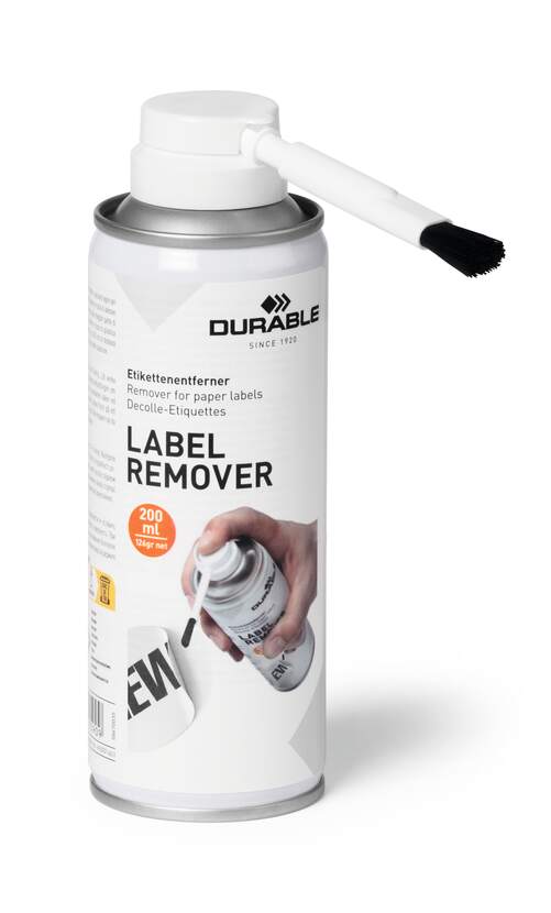 Etikettborttagningsmedel. Sprayflaska med 200 ml borttagningsmedel med en liten borste. Tar effektivt bort självhäftande pappersetiketter. Fukta etiketten (pensla ut medlet, låt verka 4-5 minuter och etiketten släpper. Lämnar inga rester. Använd på glas- eller metallytor, ej träytor.