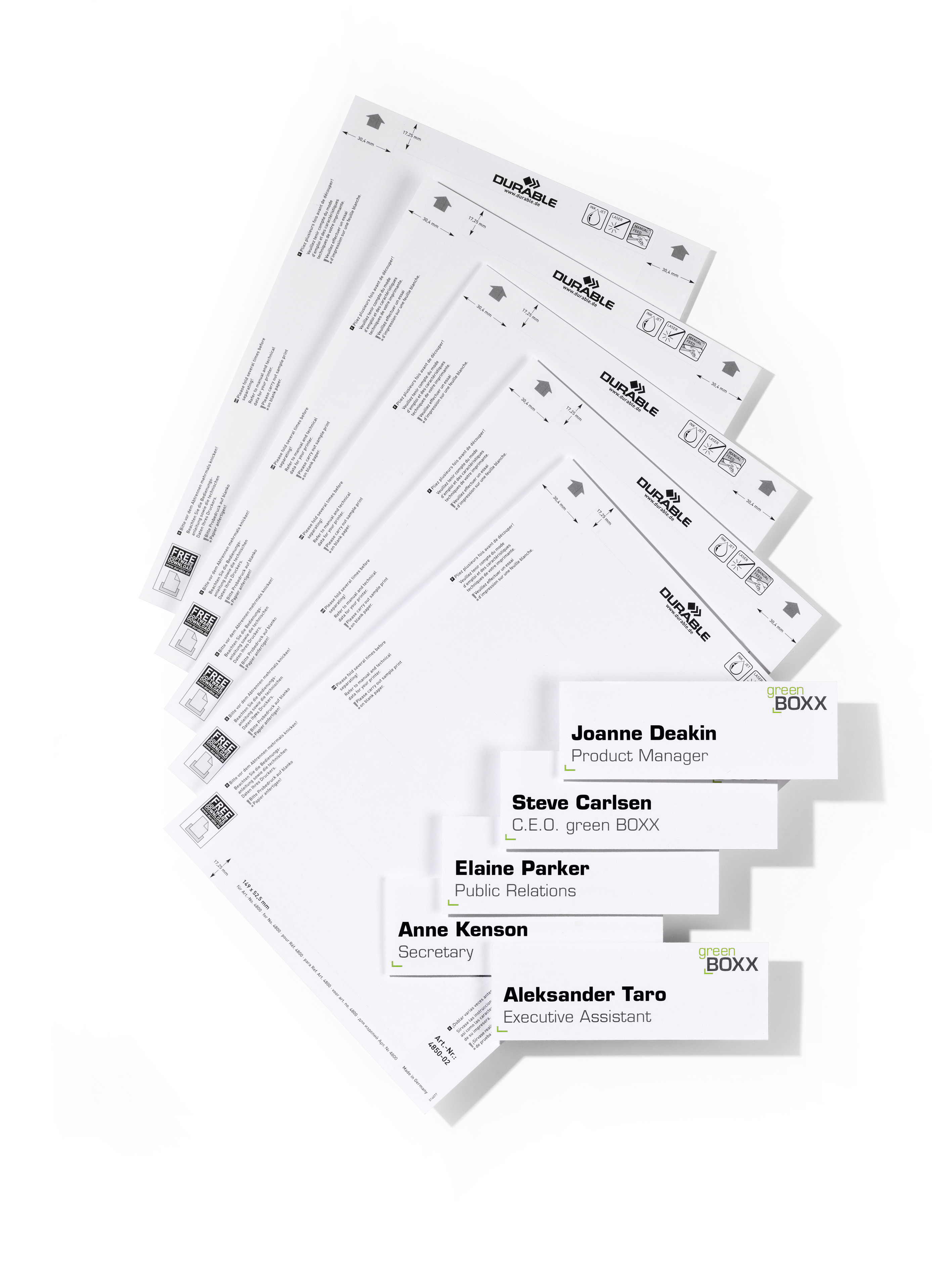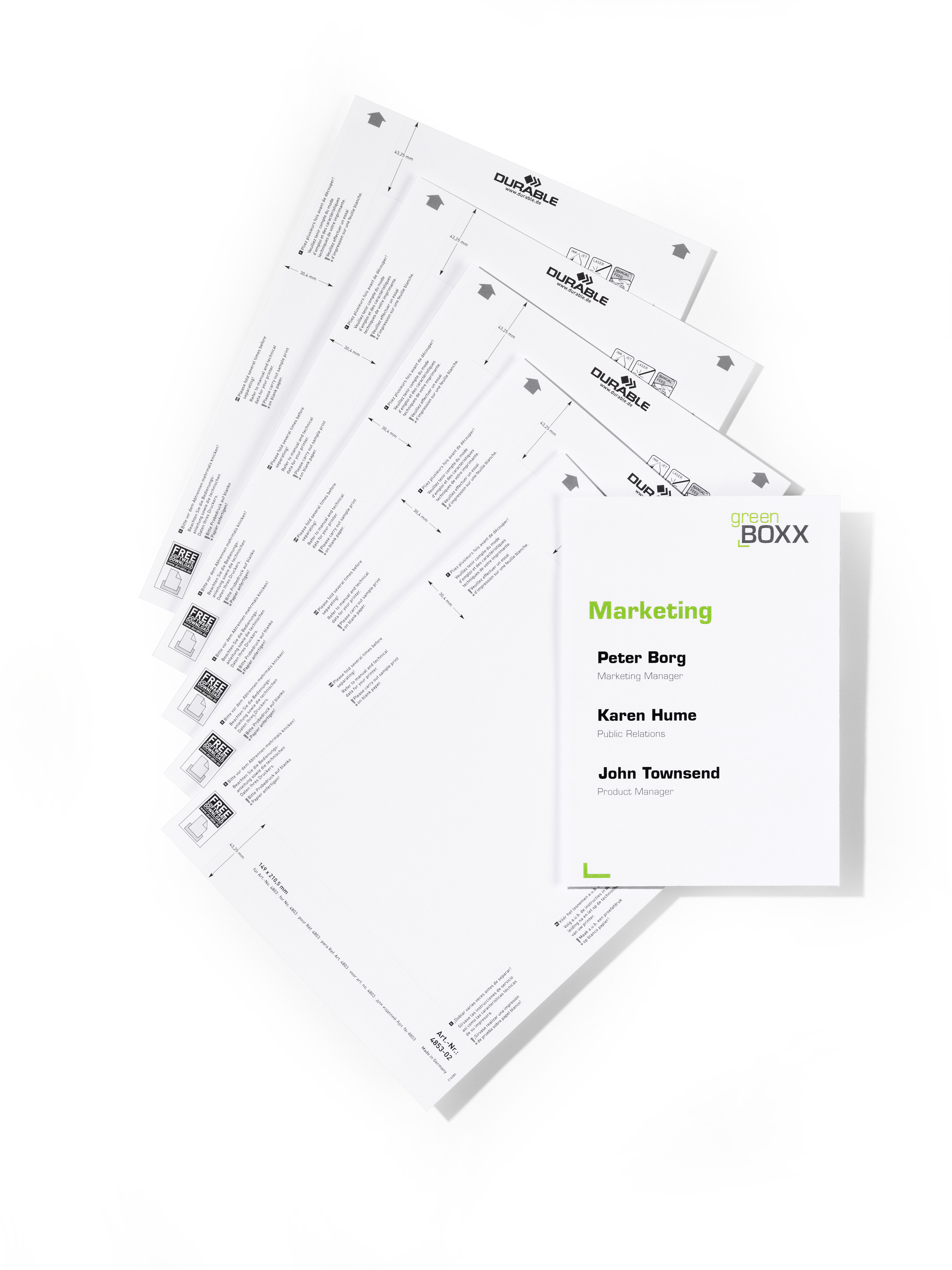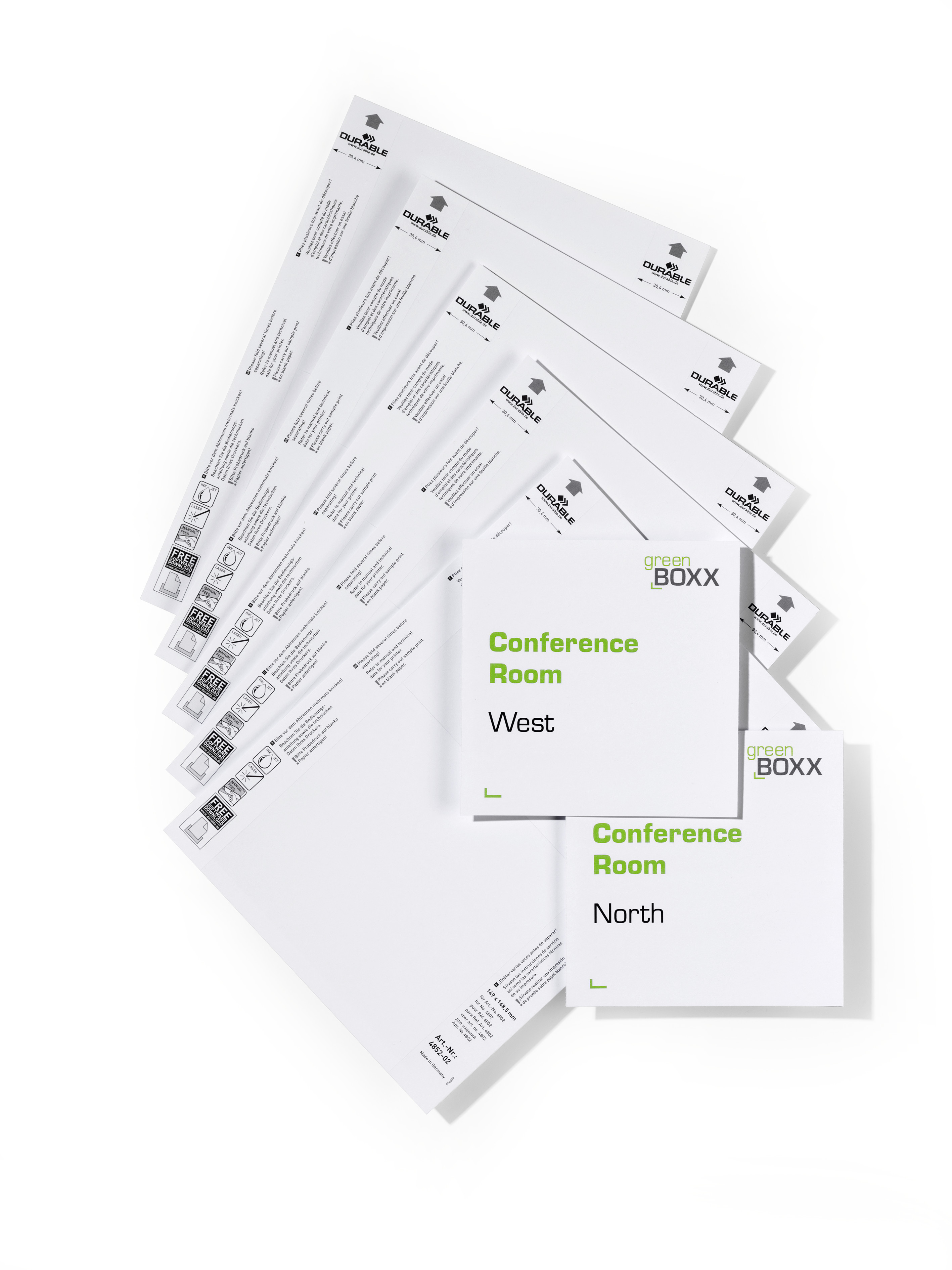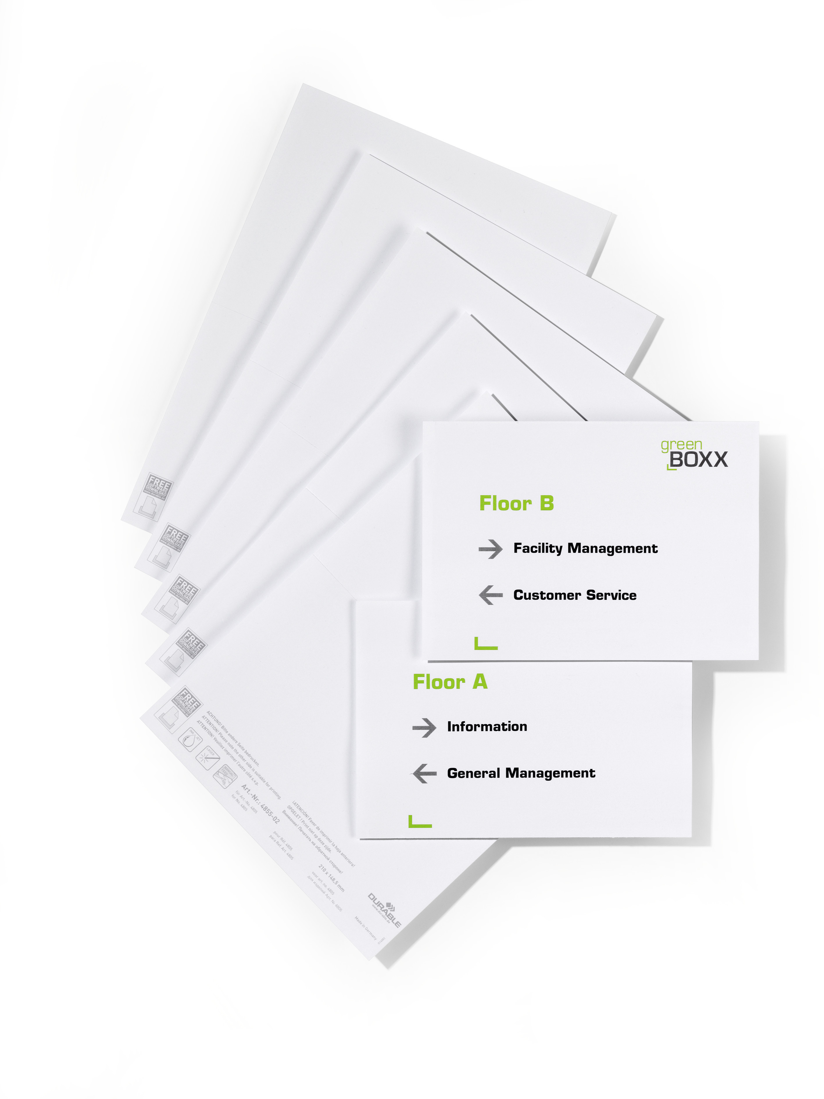 Vita 160 gr A4 ark som passar till skyltarna INFO SIGN 4820 och CLICK SIGN 4860 med format 105x105mm. Designa skylten med hjälp av gratisprogrammet DURAPRINT® som finns på www.duraprint.se och skriv ut med laserskrivare. En förpackning innehåller 10 ark med 5 skyltinstick/ark. Arken är perforerade och lätta att riva isär.