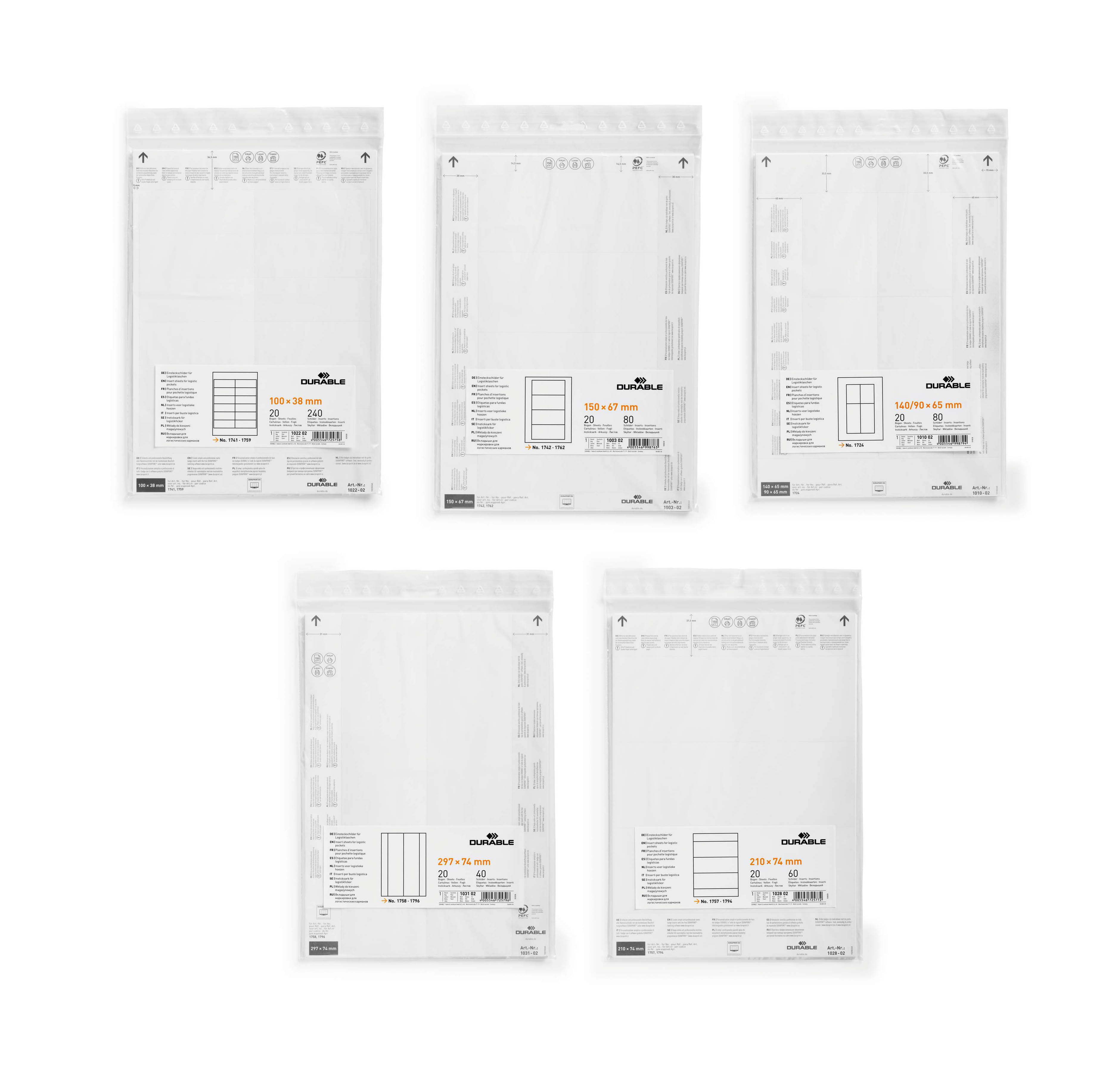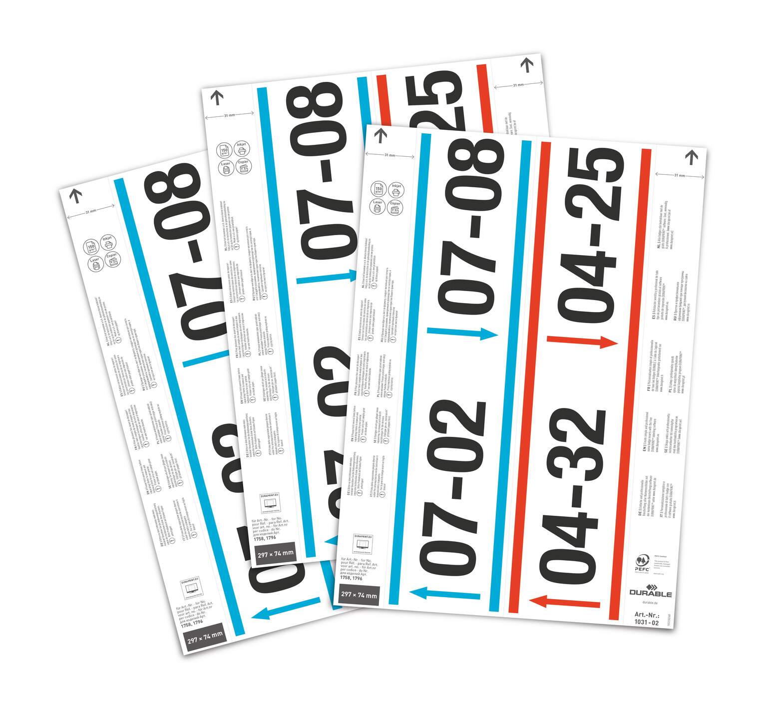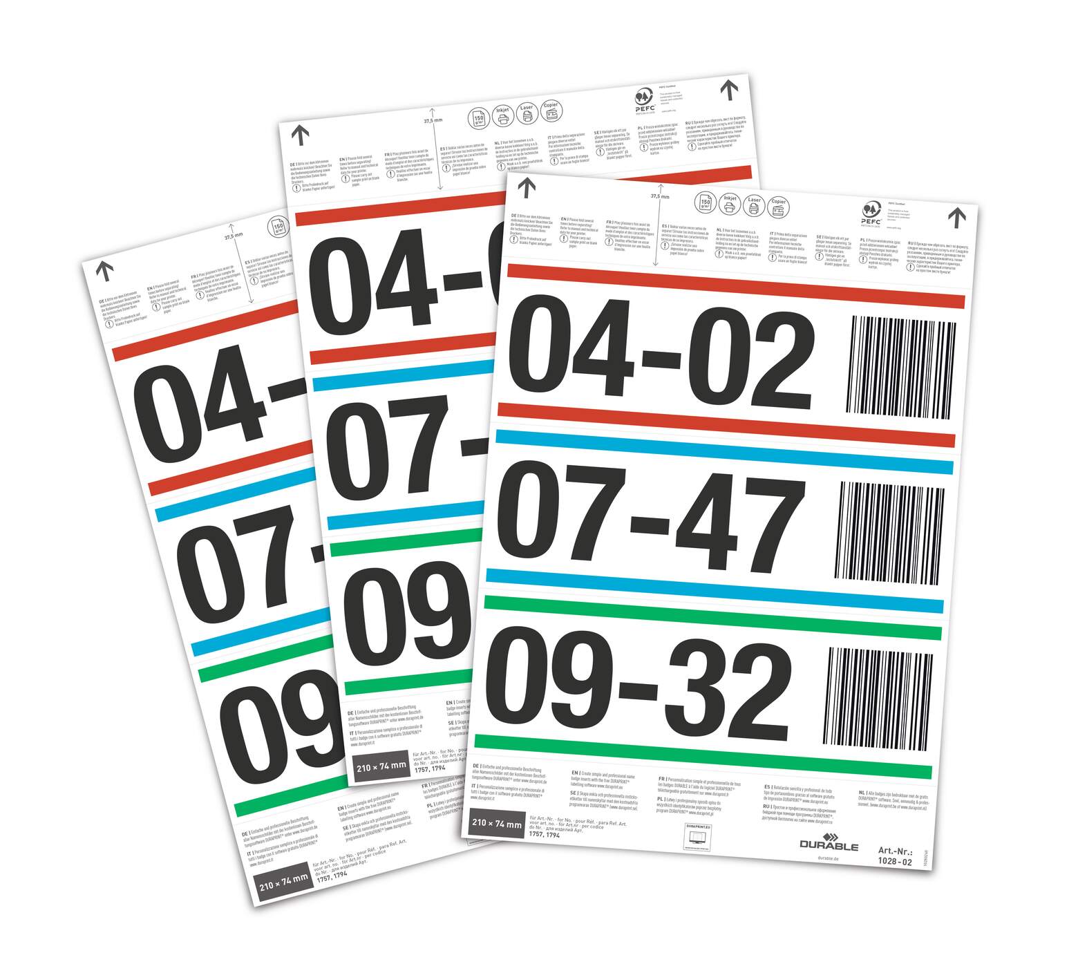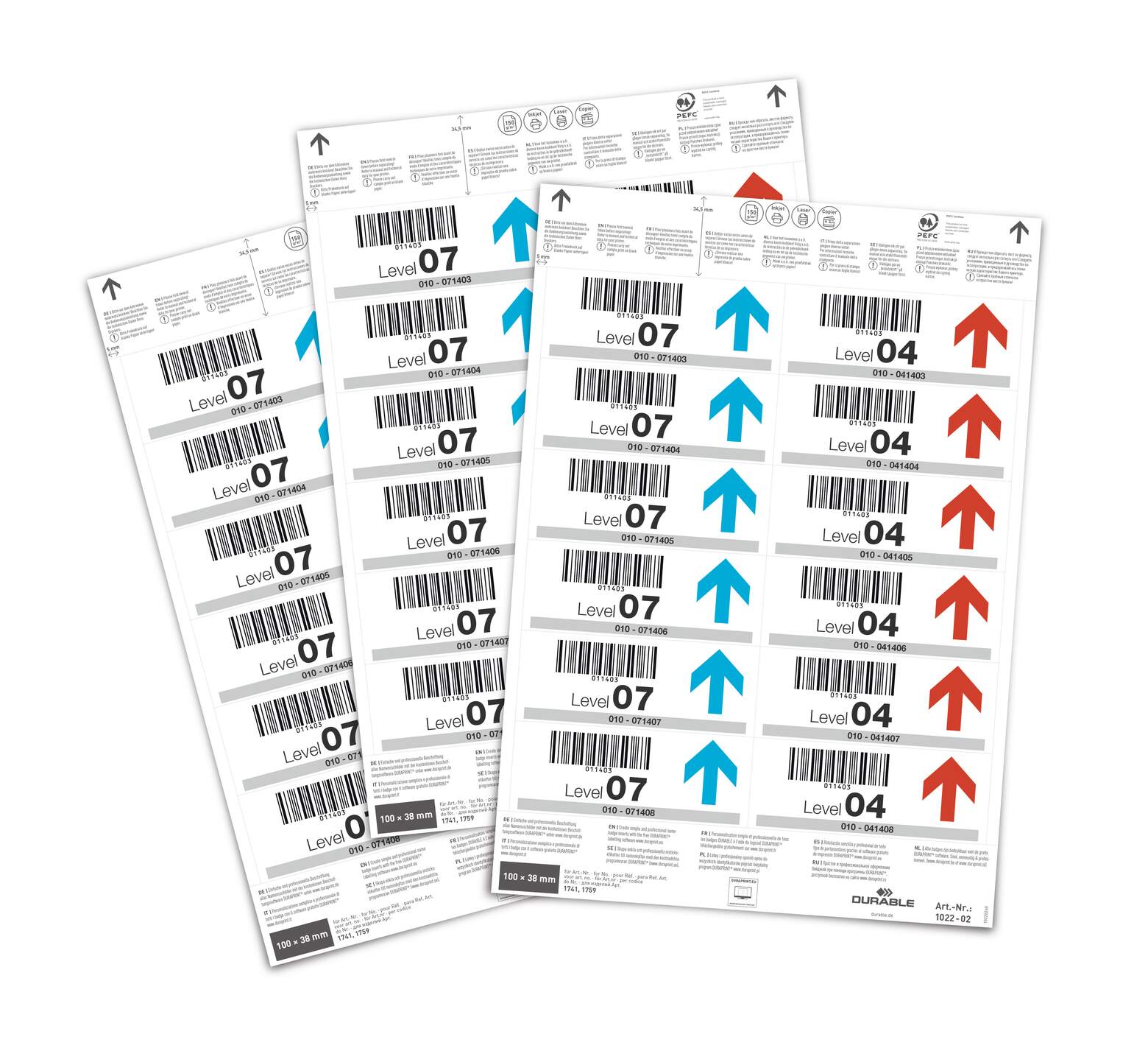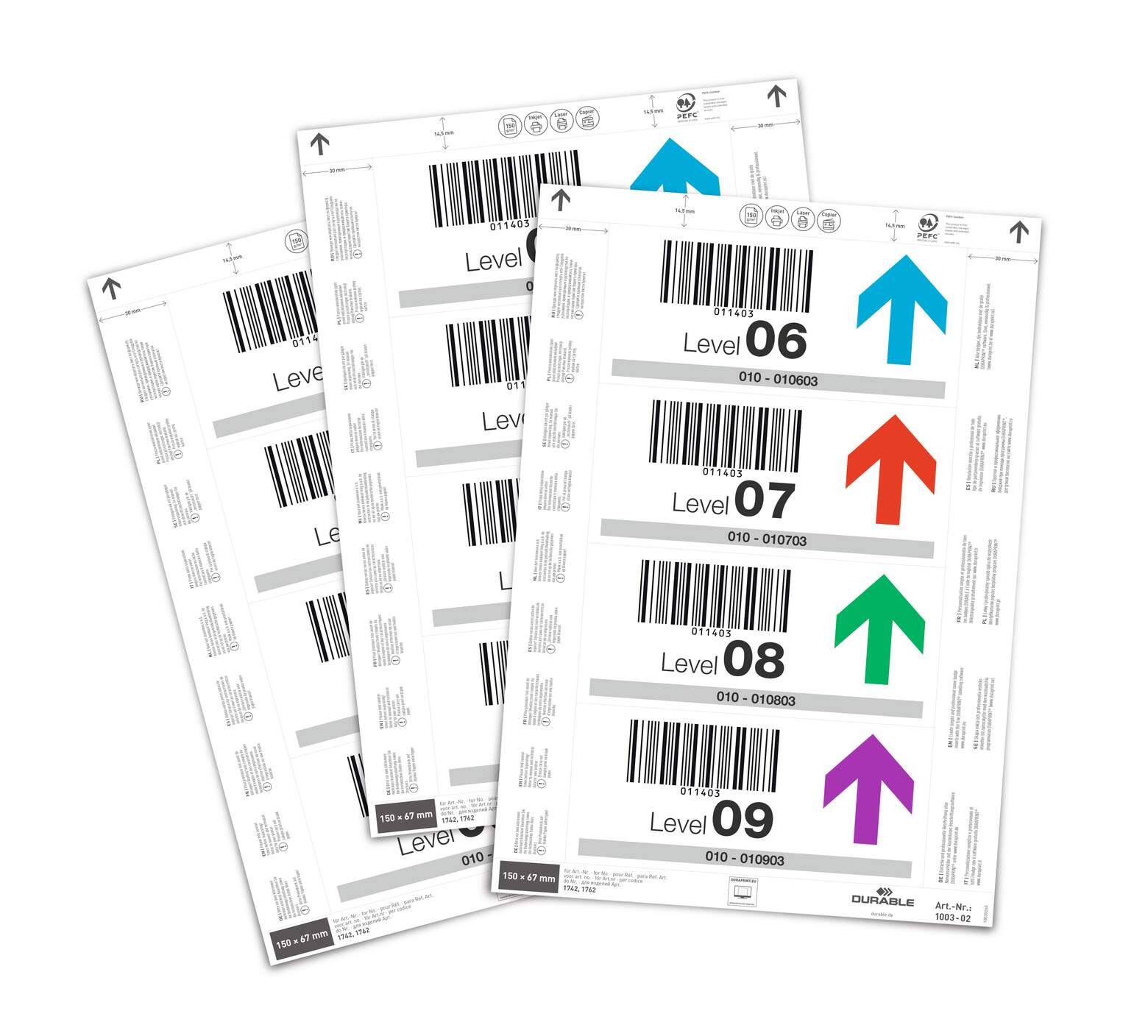 Tydlig och översiktlig märkning av hyllor, skåp , dörrar, containrar och andra utrymmen förbättrar och effektiviserar arbetsprocessen på lager och i produktionsanläggningar. Etiketter passande till DURABLE etiketthållare: A4-ark med etiketter som är lätta att riva isär. För snygga etiketter använd mallarna i gratisprogrammet DURAPRINT® på www.duraprint.se. Designa och skriv sedan ut i laser och inkjetskrivare samt kopiatorer.