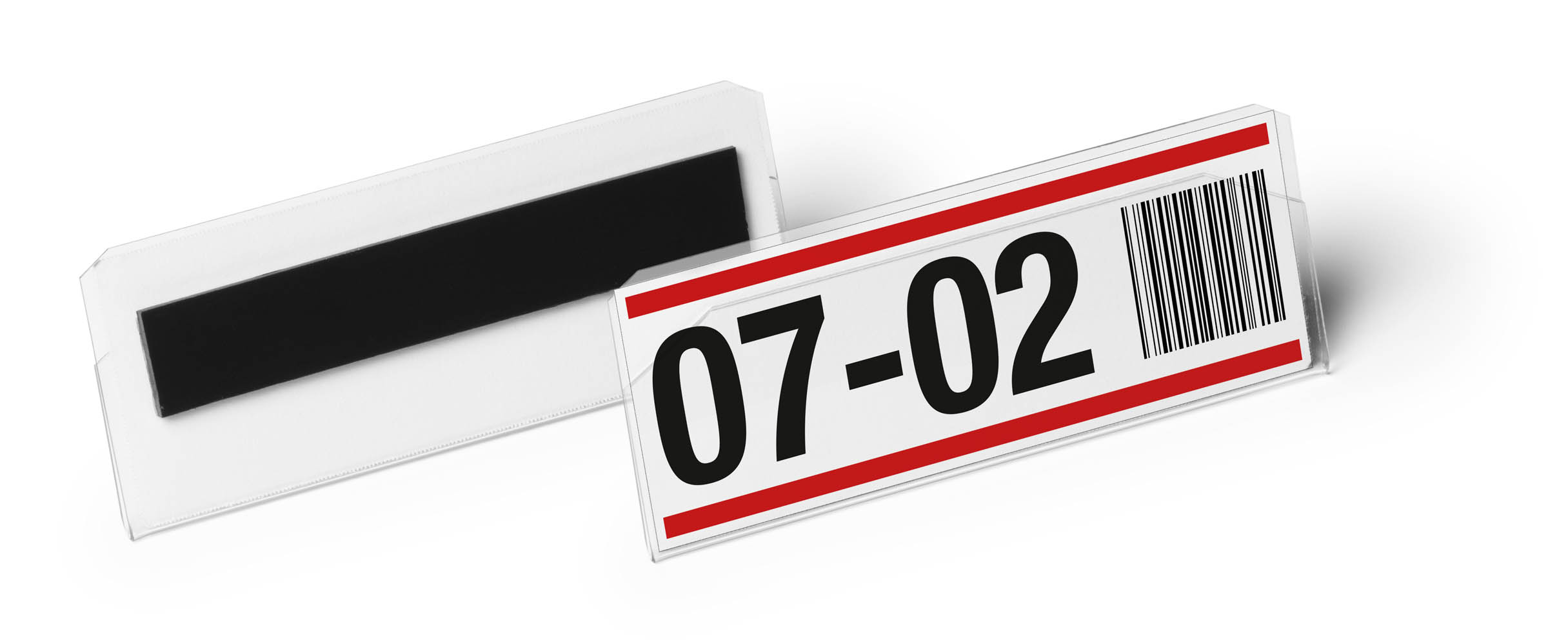 Tydlig och översiktlig märkning av hyllor, skåp , dörrar, pallar, containrar och andra utrymmen förbättrar och effektiviserar arbetsprocessen på lager och i produktionsanläggningar. De transparenta, magnetiska etiketthållarna av styv PET plast går att läsa med skanner. Etiketterna är lätta att byta eftersom fickorna är öppna upptill och på båda sidorna och dessutom med avfasade hörn för att lätt få tag i etiketten. Två magnetremsor på baksidan gör att fickan sitter stadigt på plats. Gratis mall för etiketten finns på www.duraprint.se.