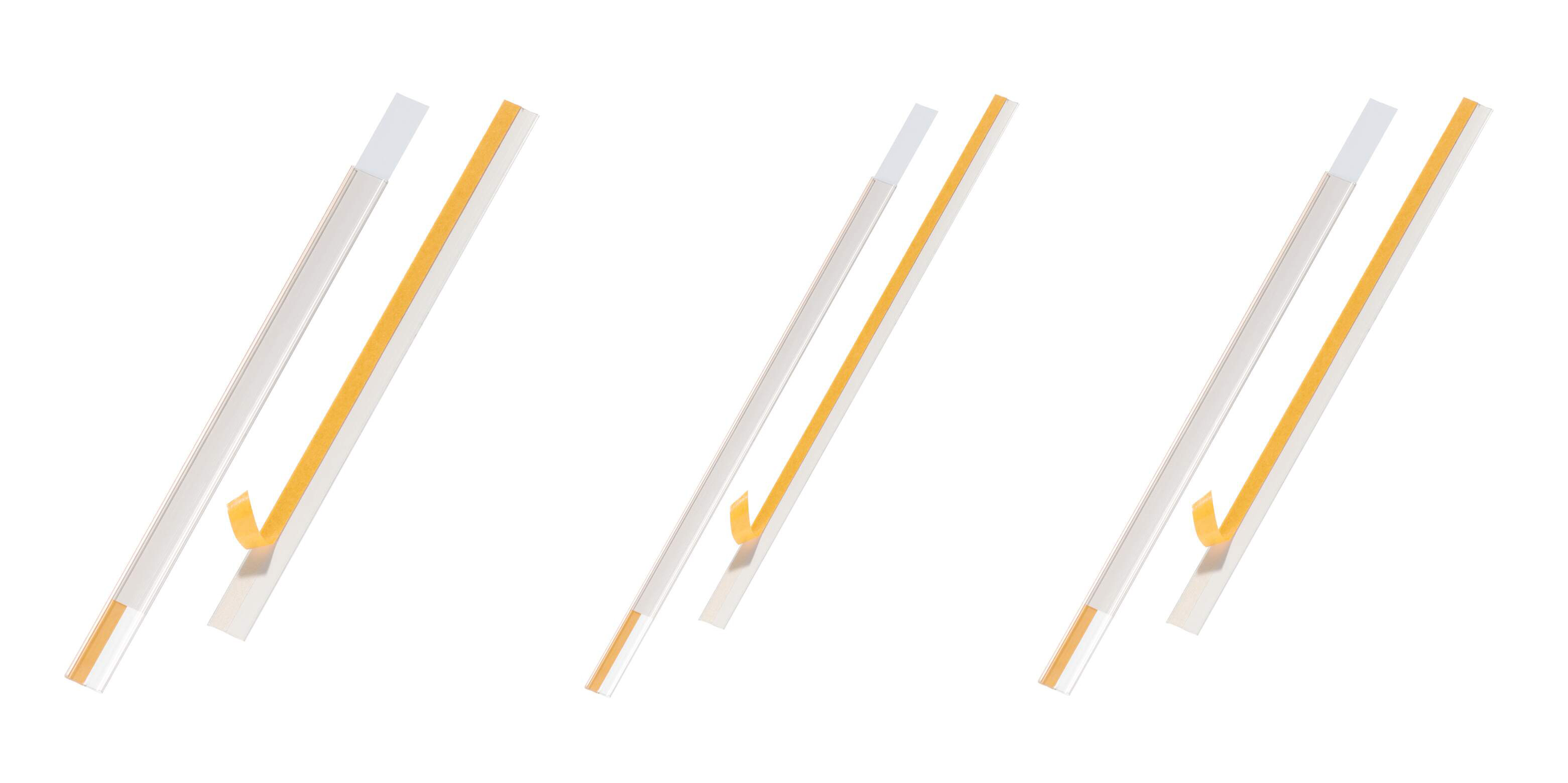 Självhäftande skanningsbar etiketthållare för märkning av t ex hyllkanter. Öppen upptill och på sidan. Skrivhöjd 2 cm, längd 1 meter.