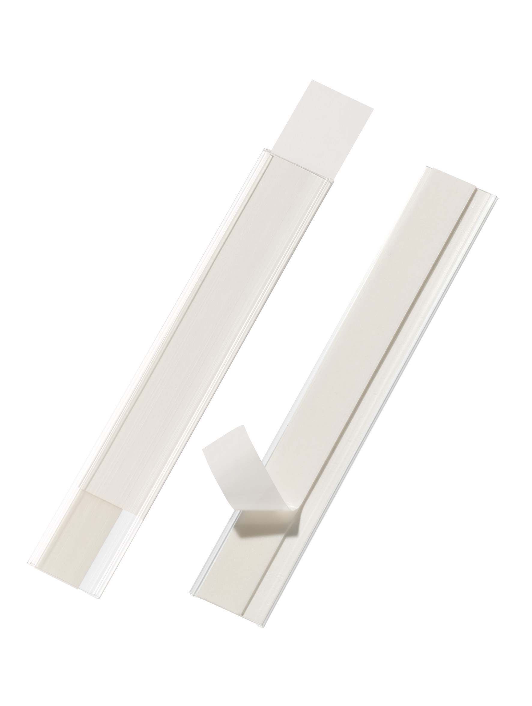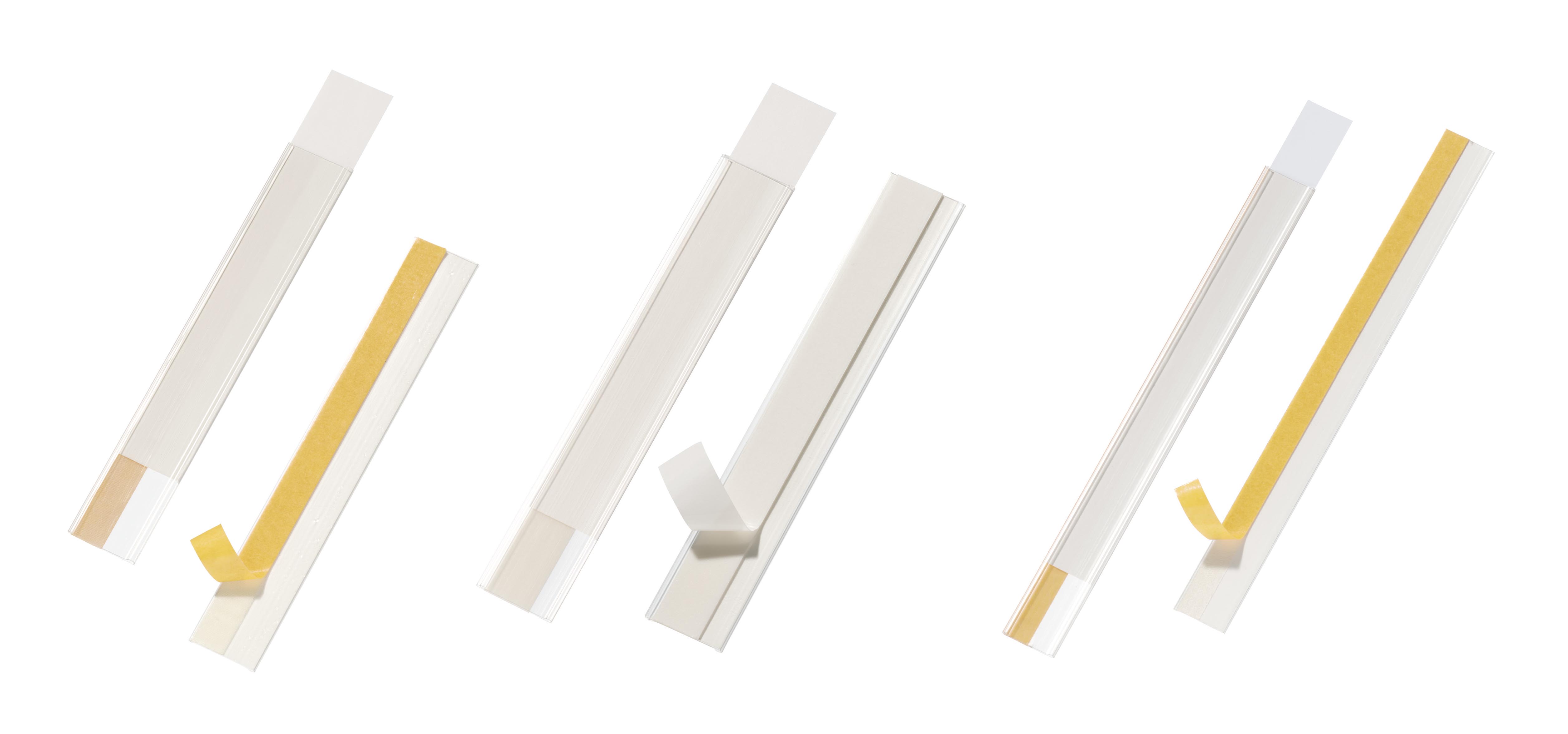 Självhäftande skanningsbar etiketthållare för märkning av t ex hyllkanter. Öppen upptill och på sidan. Skrivhöjd 2 cm, längd 20 cm.
