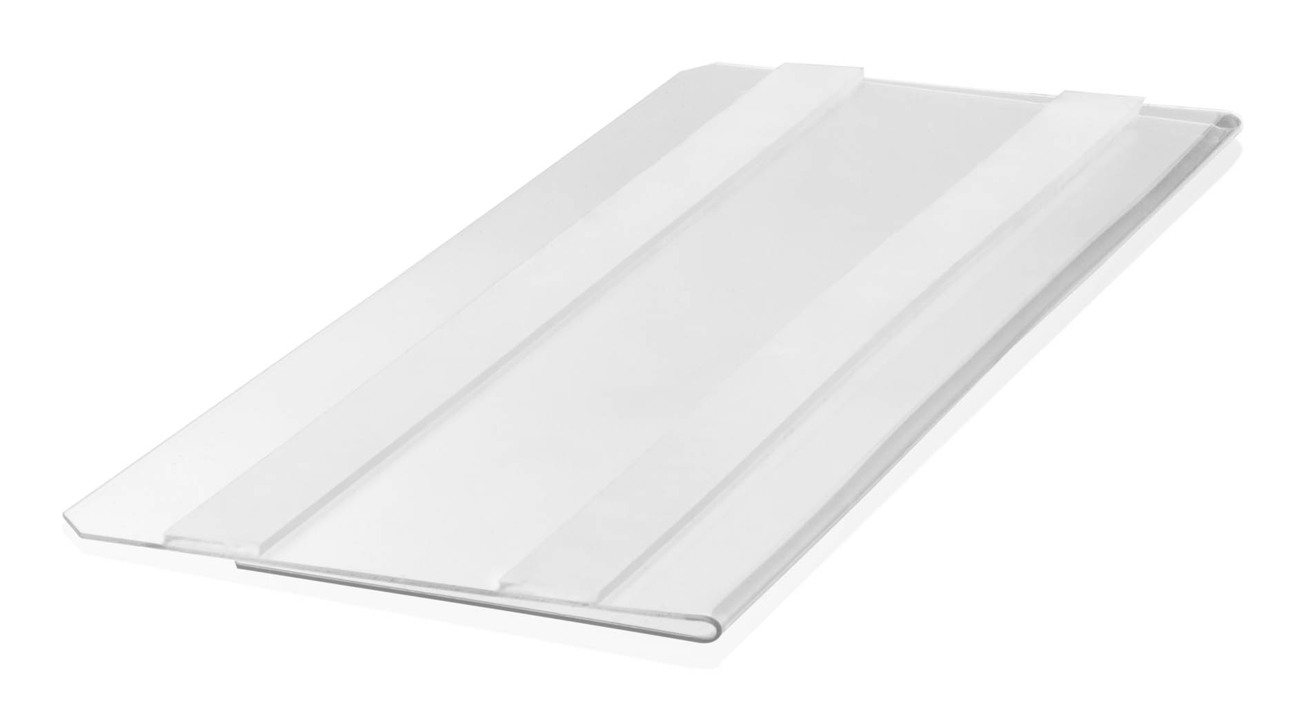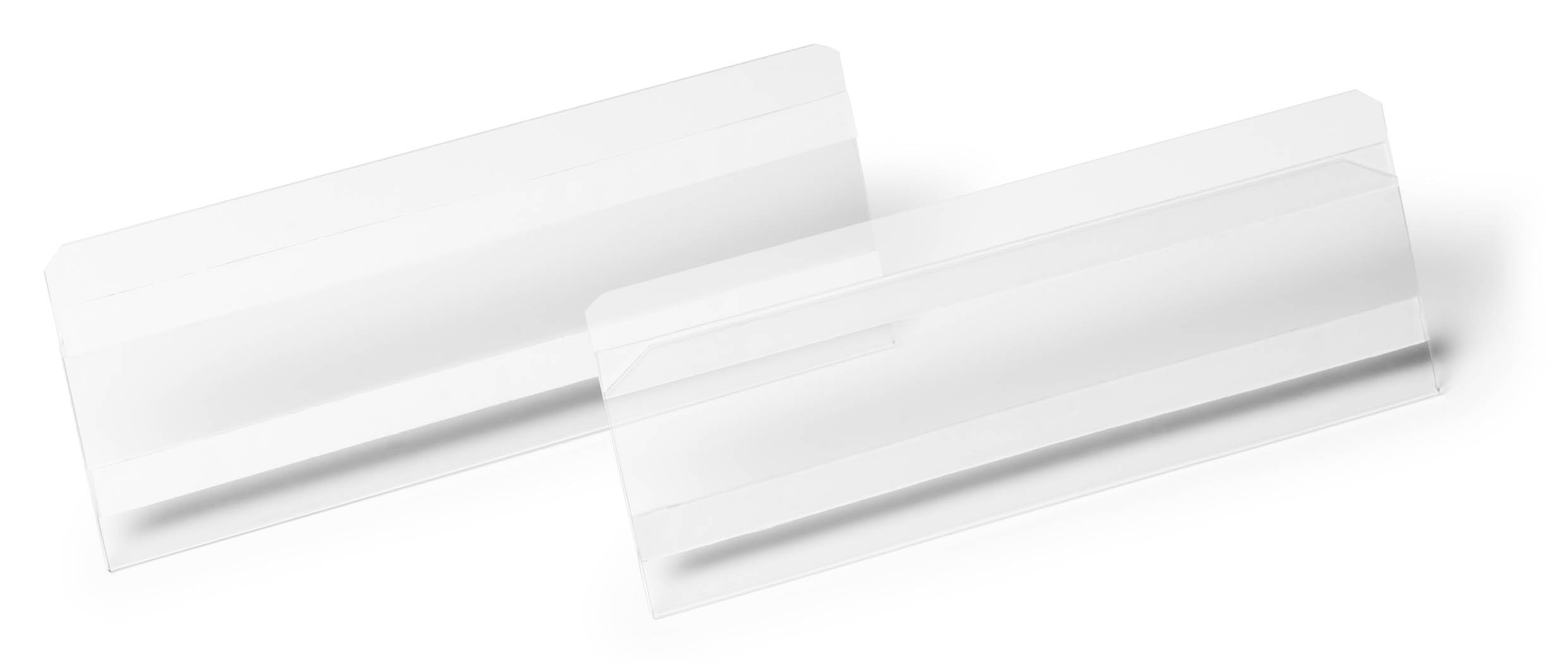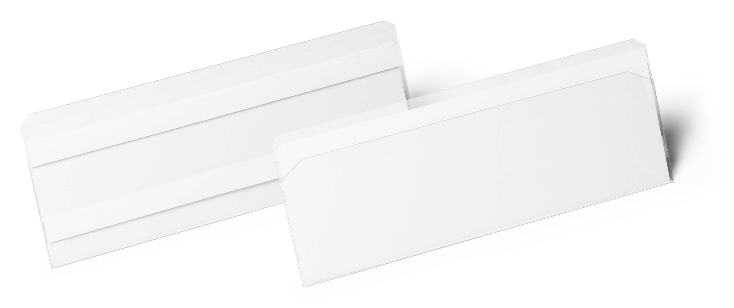Etiketthållare i PET plast med självhäftande och borttagbara klisterremsor på baksidan. För användning på t ex hyllkanter.