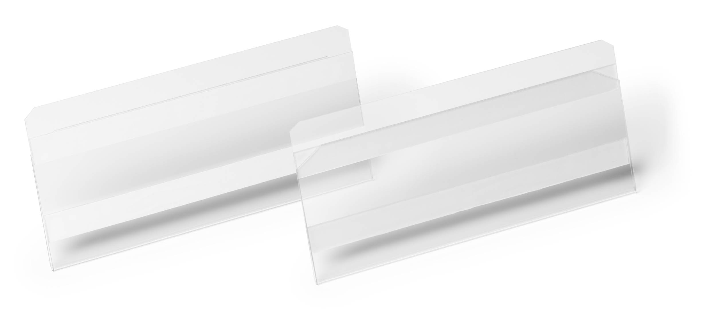 Etiketthållare i PET plast med självhäftande och borttagbara klisterremsor på baksidan. För användning på t ex hyllkanter.