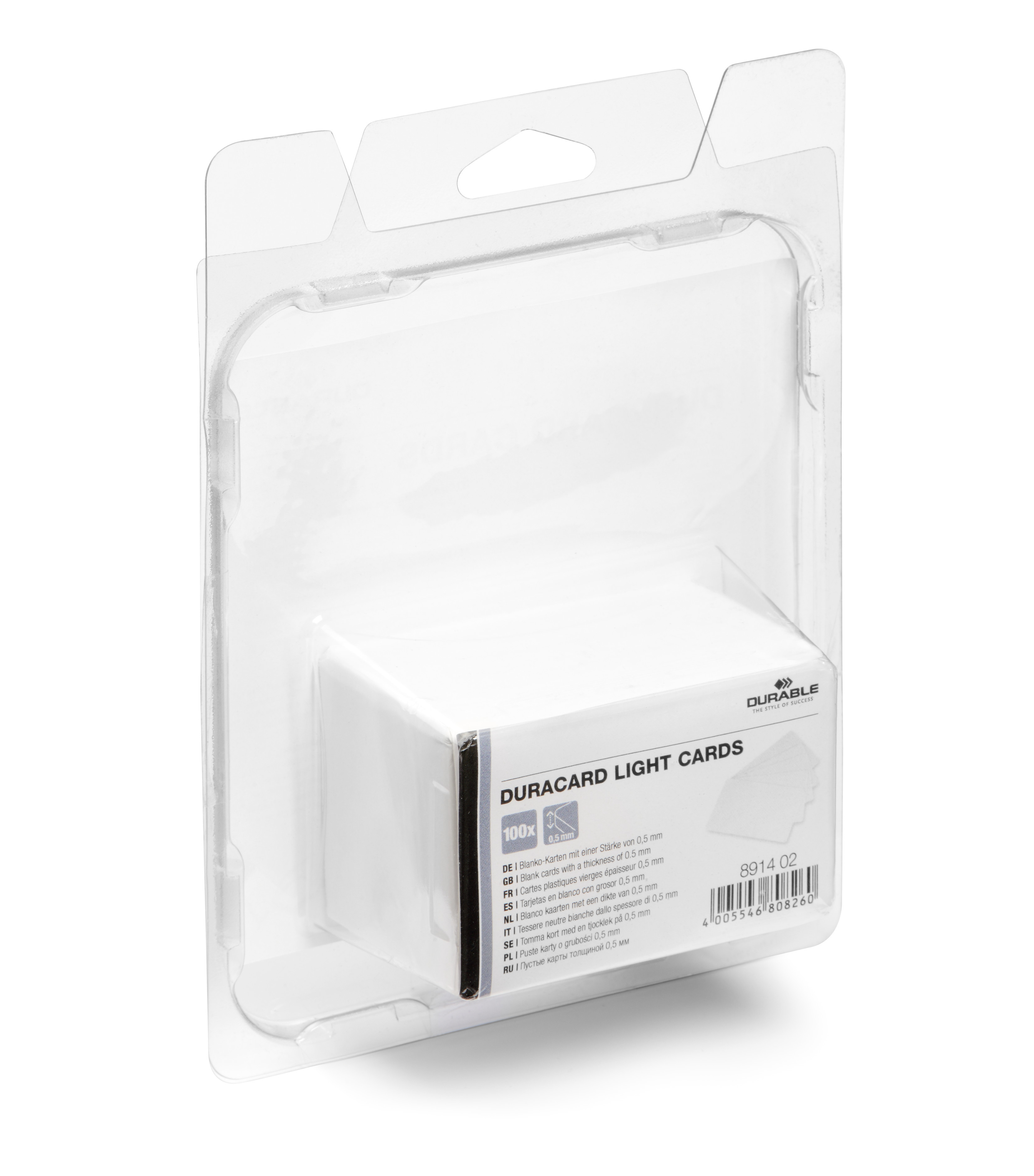 100 st tunna kort som kan användas som t ex namnskyltar och medlemskort och skrivas ut i DURACARD ID 300 kortskrivare. Korten är 0,5 mm tjocka. Mått: 53,98x85,60mm (kreditkortsformat). Tillbehör: Passerkortshållare och ID -kortshållare med olika tillbehör. Magnetset 891700