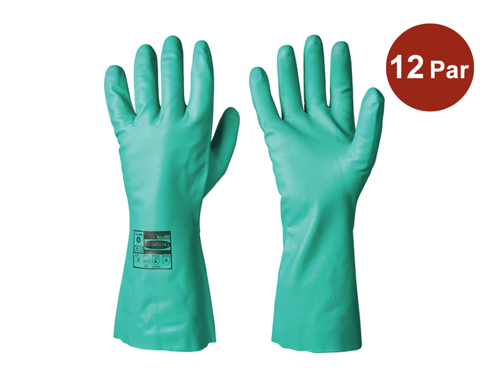 Granberg 114.1000 är slitstarka nitrilhandskar som lämpar sig för våta arbeten och kemikaliehantering inom fiskeindustri, livsmedelsindustri, tillverkningsindustri, jordbruk, oljeindustri, sanering och underhåll. Handskarna är längre än vanliga modeller och ger därför extra skydd även upp på handlederna. Den flossade insidan gör dem mycket bekväma och det räfflade mönstret på handflatan och fingrarna ger en halksäker yta. Nitrilgummit gör handskarna särskilt motståndskraftiga mot kontakt med olja, fett och andra kemikalier, och de är idealiska att använda i både torra och våta förhållanden.