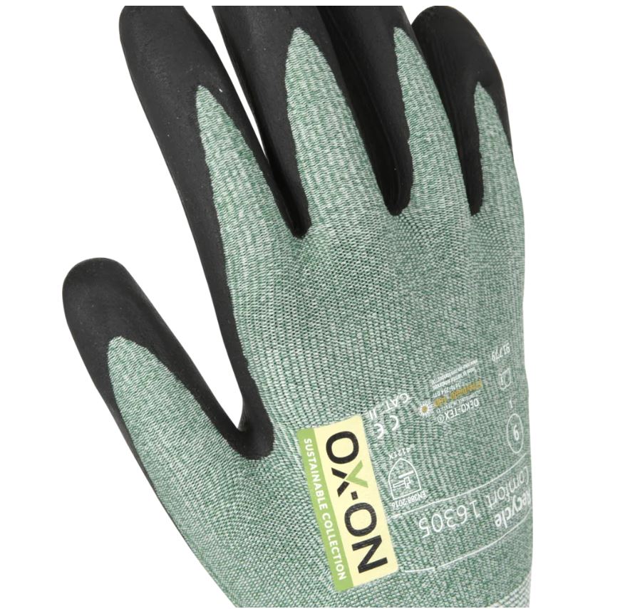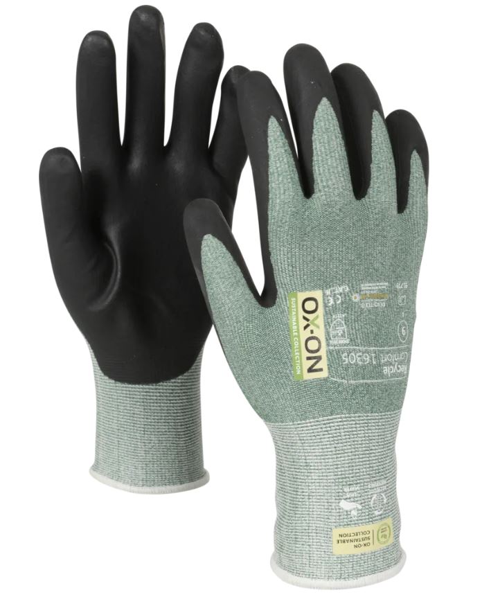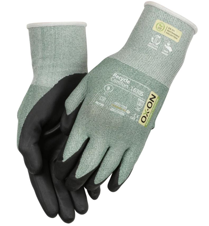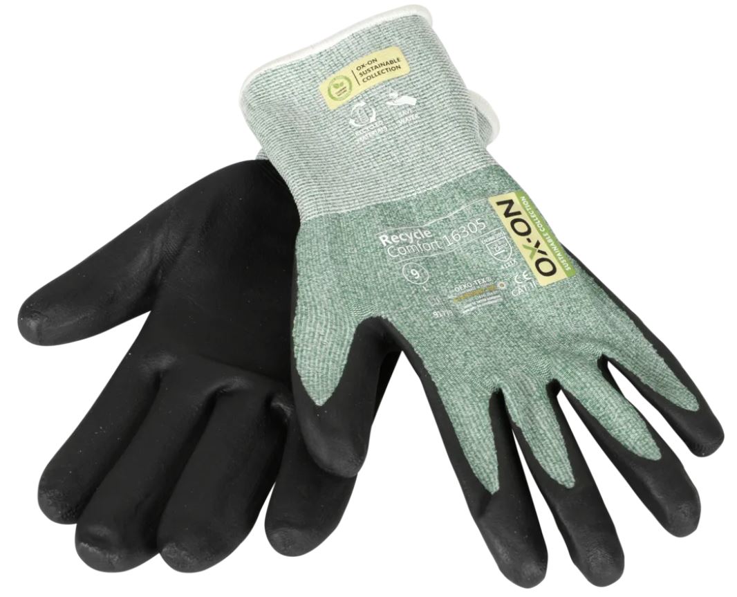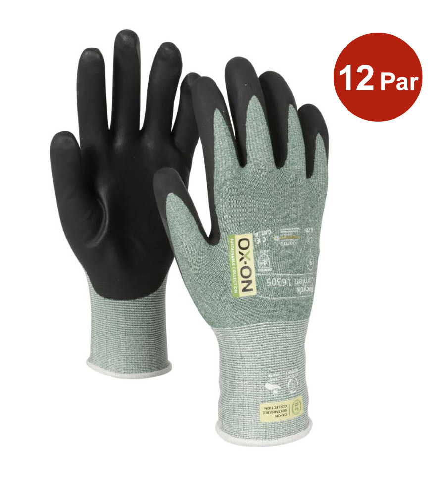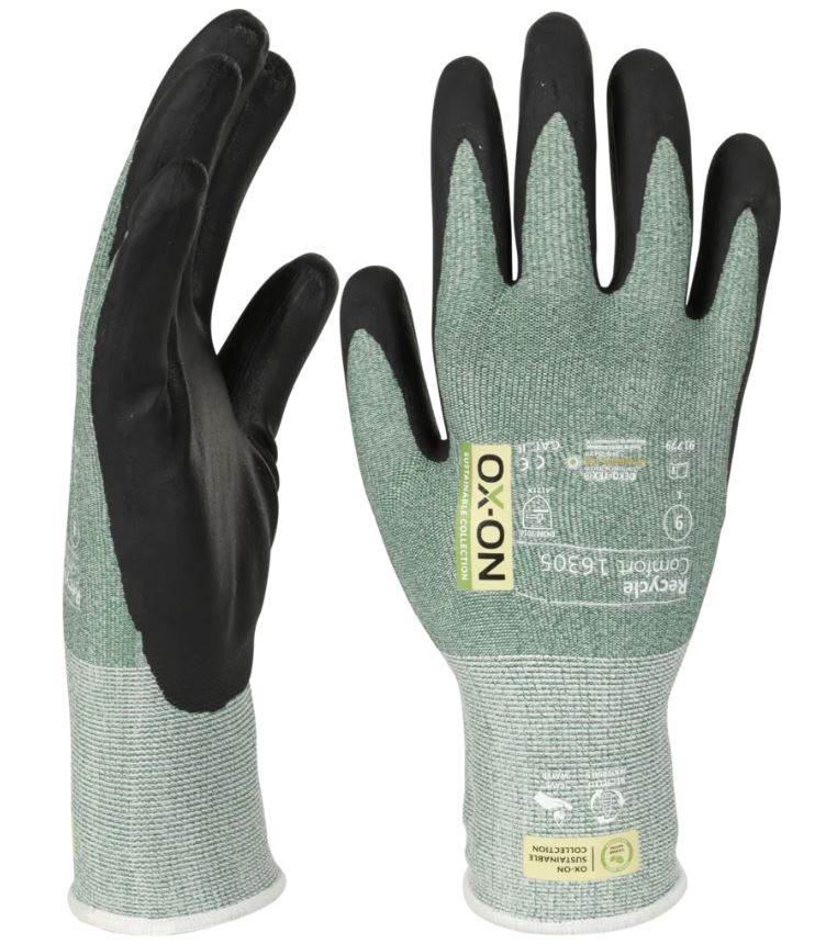 OX-ON Recycle Comfort 16305 är en allroundhandske för alla som behöver hög precision och funktionalitet på jobbet. Handsken är idealisk för jobb som slipning eller montering och är avsedd för snickare, murare, maskinförare m.m. 50% av handskens stickning är gjord av återvunnen polyester från använda plastflaskor och resten av nylon och elastan. Detta säkerställer en hög nivå av motståndskraft mot nötning och en bra passform. Handsken är även Oeko-Tex certifierad, vilket är din garanti för att den inte innehåller farliga kemikalier eller färgämnen. Recycle Comfort 16305 är en lättviktshandske som sitter tätt och bekvämt. Den är fingerdoppad och handflatan är belagd med nitrilskum, vilket ger ett exakt och säkert grepp. Sammantaget består handskarna av 30% återvunnet material och är ett utmärkt val för torra miljöer när extra fingerkänslighet krävs.