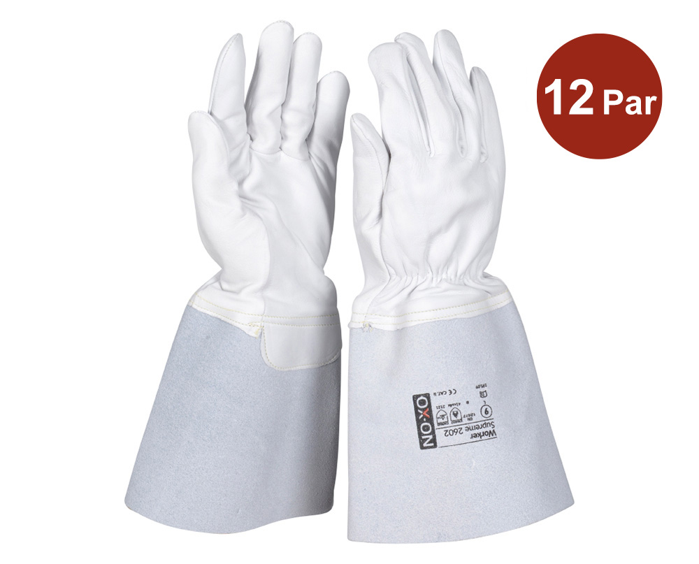 OX-ON Worker Supreme 2602 är för dig som vill ha en förstklassig TIG-svetshandske med unik fingerkänsla. Endast de bästa materialen används i framställningen av denna handske som är tillverkad i 100 % getskinn. Den speciella kevlartråden är starkare och mer hållbar än vanliga trådar. Naturligtvis är säkerheten en av handskens viktigaste funktioner. Denna OX-ON-handske har en 14 cm lång manschett som ger skydd långt upp på armen. Worker Supreme 2602 är inte fodrad, därmed bibehåller du den optimala fingerkänslan. Du får en mycket exklusiv svetshandske som sitter bra på handen och kan användas under lång tid.