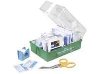 Första Hjälpenlåda II. Avsedd för c:a 10 anställda. Innehållet är anpassat till dagens krav för bygg-, skogs- och tillverkningsindustrin. Lådan är tillverkad av grön plast och försedd med gångjärn. Fukt- och dammtät. Innehåll: 10 st Sårtvättare, 3 st Plåsterplån med 9 plåster, 1 st Kirurgtejp 9,1 m x 25 mm, 2 st Fingertub med knytband, 1 st Fingertuta i skinn, 1 st Mitella i bomull för hög komfort, 2 st Elastisk Idealbinda 4 m x 8 cm, 1x10 st Kompresser 5 x 7,5 cm, 2 st Första Förband litet, 2 st Första Förband stort, 1 st Skyddspaket (1 par skyddshandskar, 2 st skyddstvättare), 1 st Första Förband Kombi, 1 st Sax rostfri 18,5 cm 94375, 1 st Brännskadekompress 5x15 cm, 1 st L-ABC instruktion, Hållare för väggmontage av Låda II. Mått: 25x17x12cm.