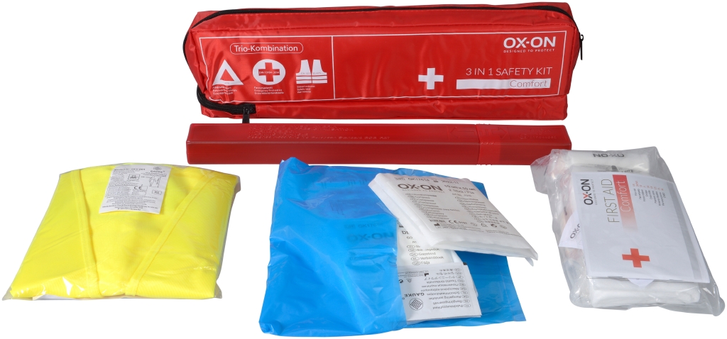 1 st. Vägledande Första hjälpen-instruktioner Med OX-ON 3 in 1 Safety kit Comfort får du ett välfyllt Första hjälpen-kit som är obligatoriskt att ha i fordon i många europeiska länder. All utrustning är samlat i den praktiska nylonväskan och kittet uppfyller alla krav enligt DIN 13164-standarden.