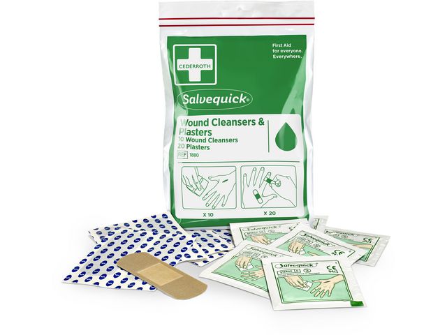 Praktisk påse med Salvequickplåster och Savett sårtvättare.