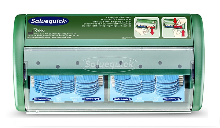 Salvequick Plåsterautomat Blue Detectable är särskilt avsedd för användning inom livsmedelsindustrin. Plåstren är detekterbara och upptäcks av de flesta metalldetektorer. Den blå färgen gör att plåstren också är lätta att upptäcka visuellt.